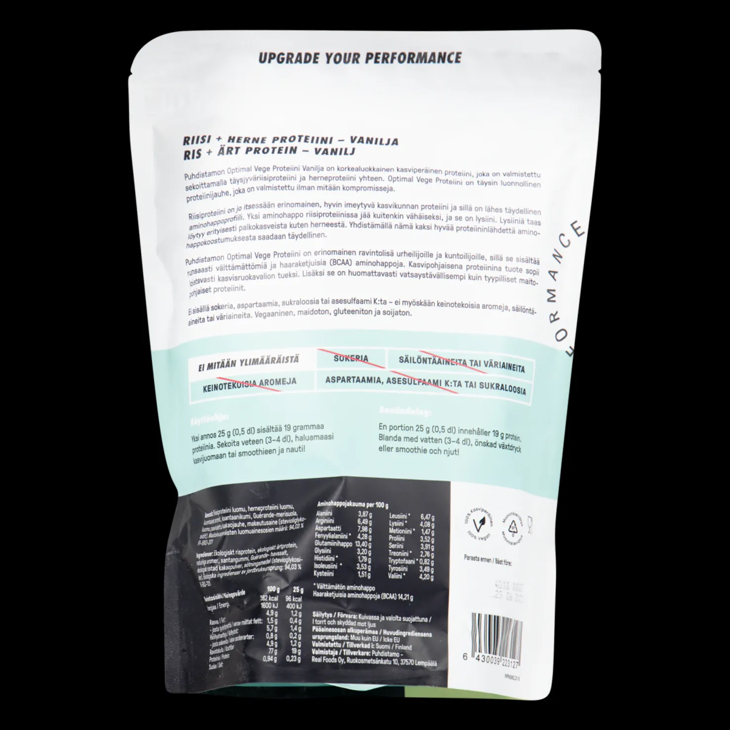 Maukas ja kasviperäinen proteiinijauhe, joka on valmistettu luonnollisista ainesosista. Edistää lihasmassan kasvua ja ylläpitoa.