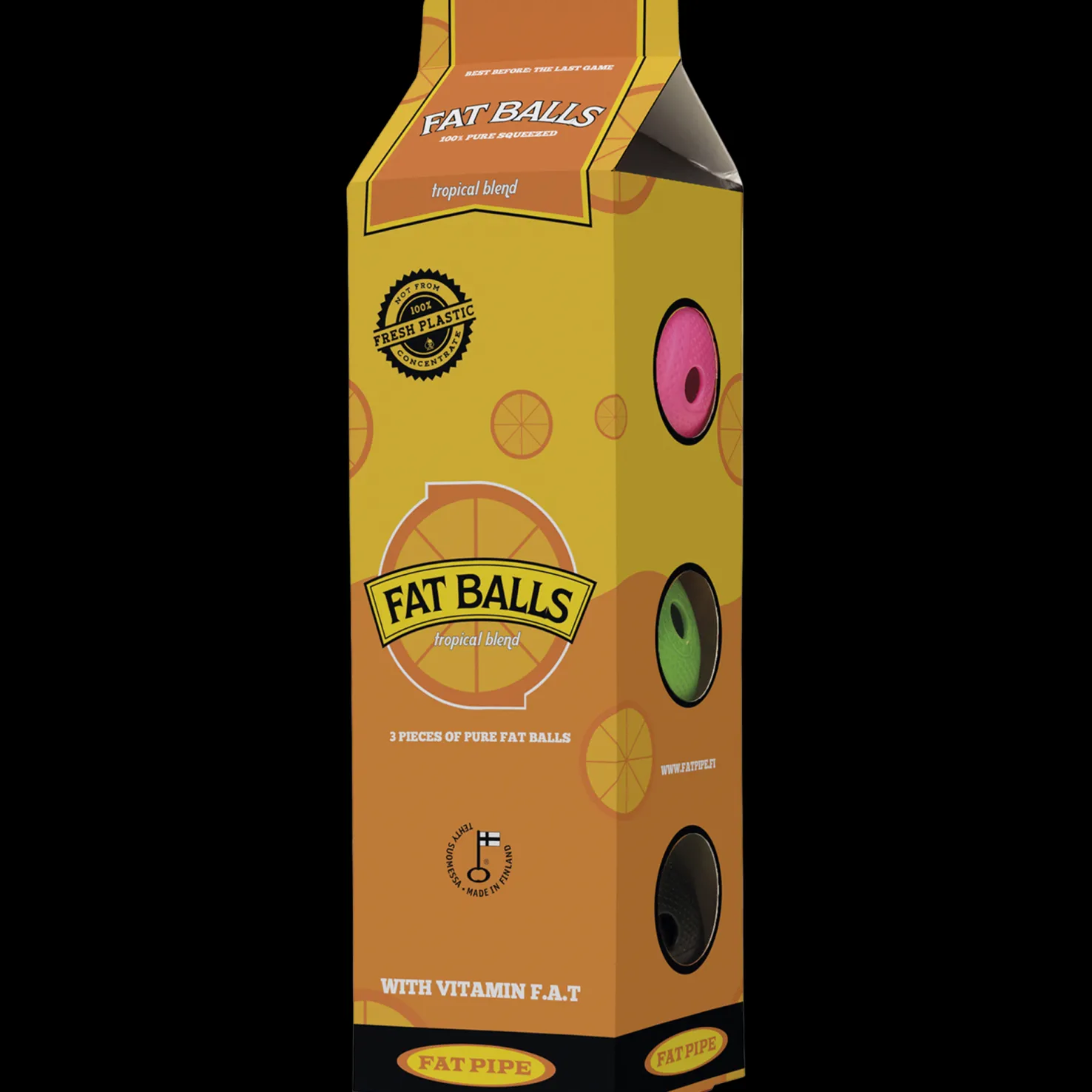 Kolme salibandypalloa: musta, vihreä ja vaaleanpunainen.