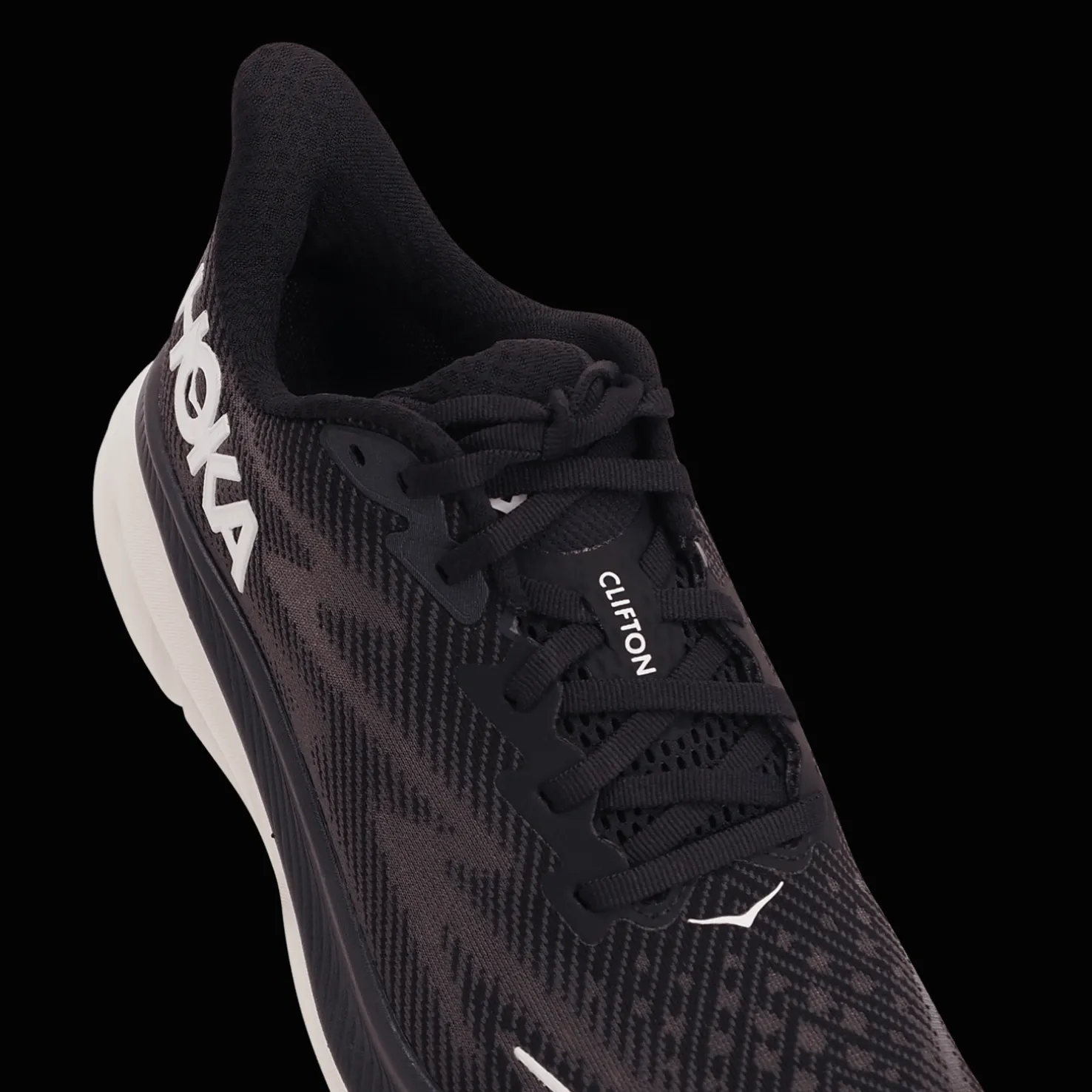 HOKA Clifton 9:n päällinen on teknistä verkkoa, joka takaa hyvän ilmanvaihdon ja mukavuuden juoksemisen aikana.