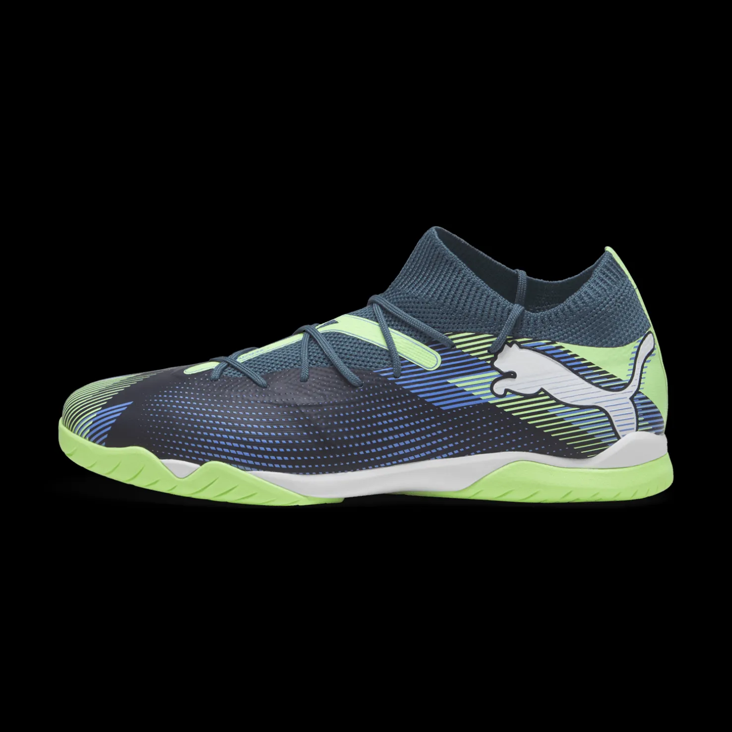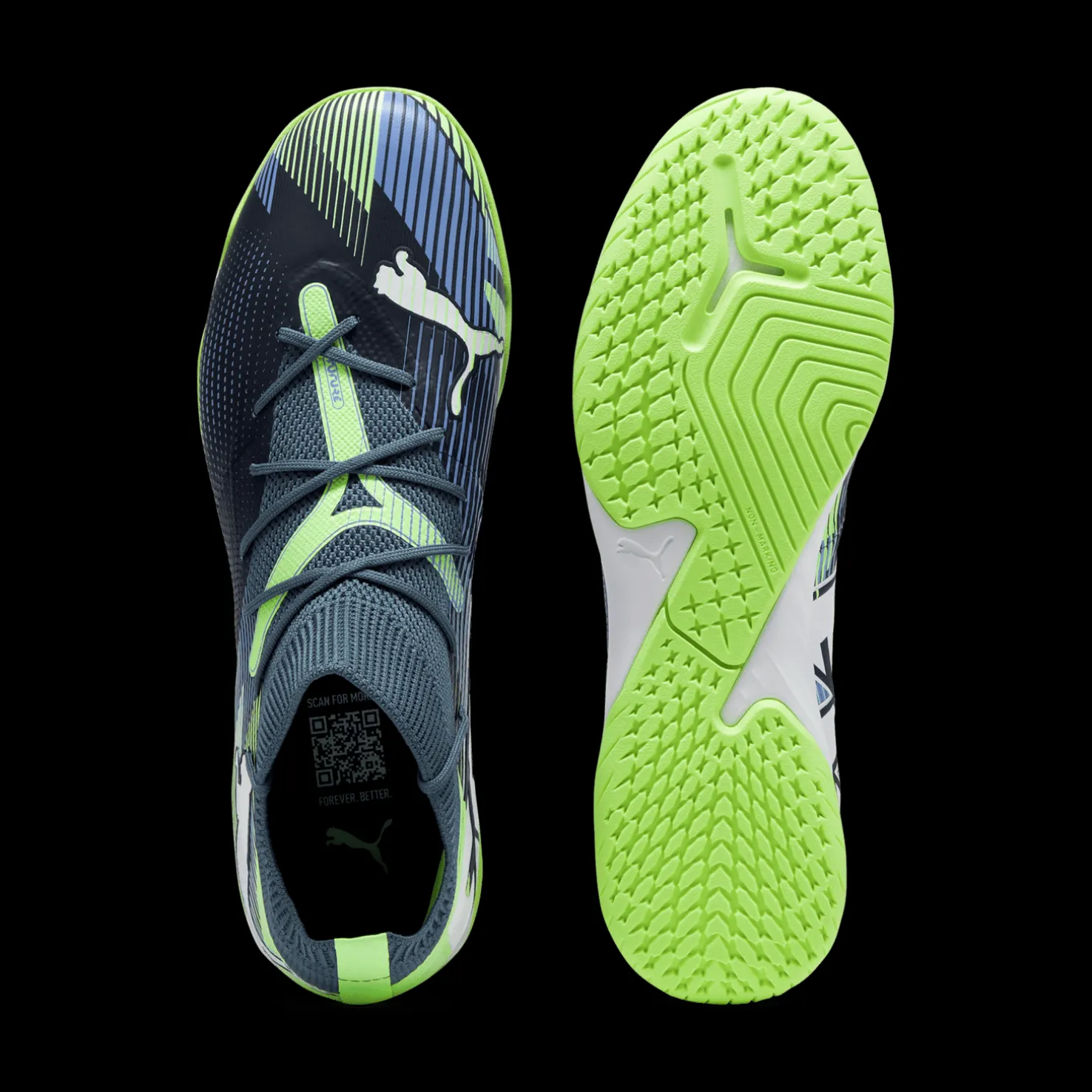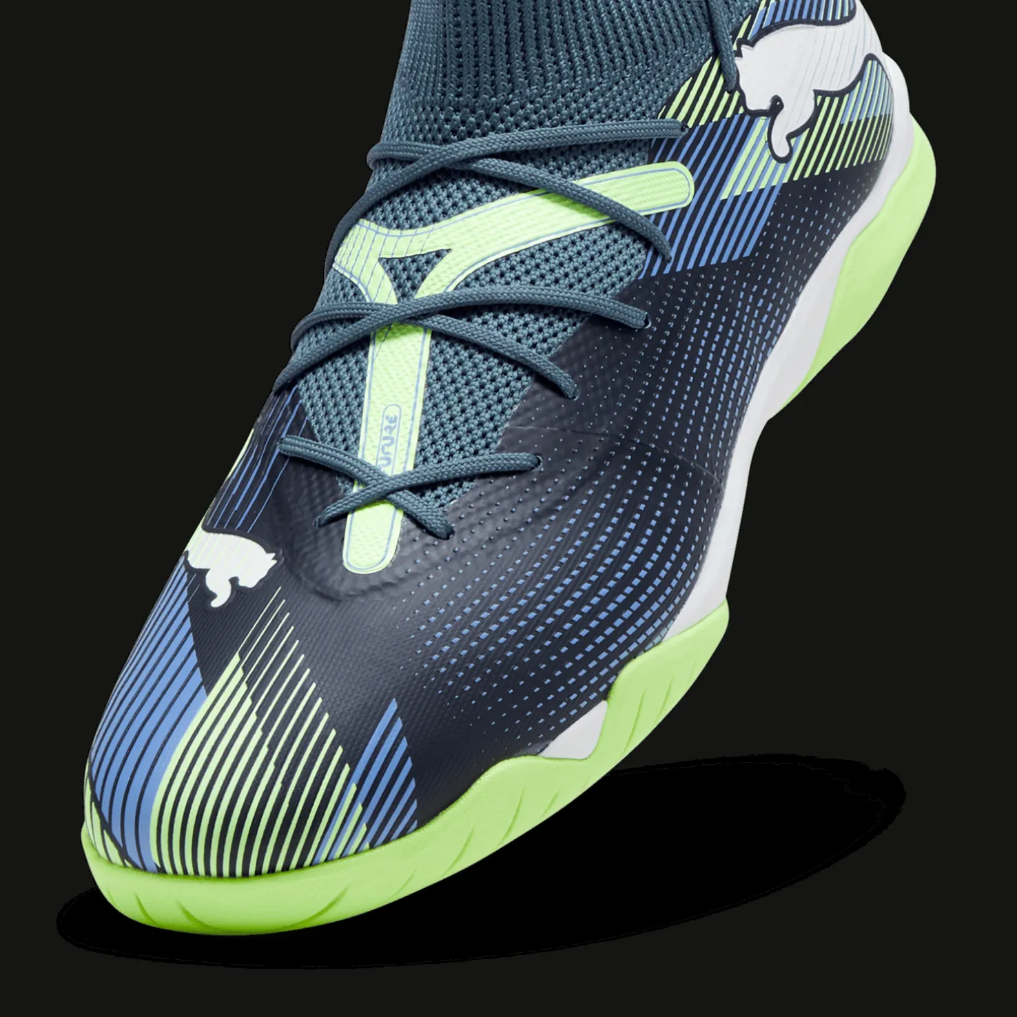 Futsalkengät käytännöllisellä ulkopohjalla, joka ei jätä jälkiä. Innovatiiviset 3D-tulostetut yksityiskohdat keskeisillä alueilla optimaalisen pallonhallinnan varmistamiseksi.