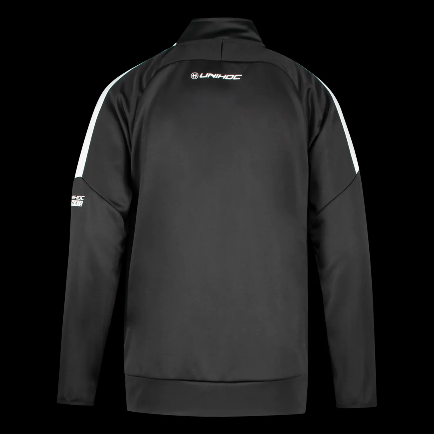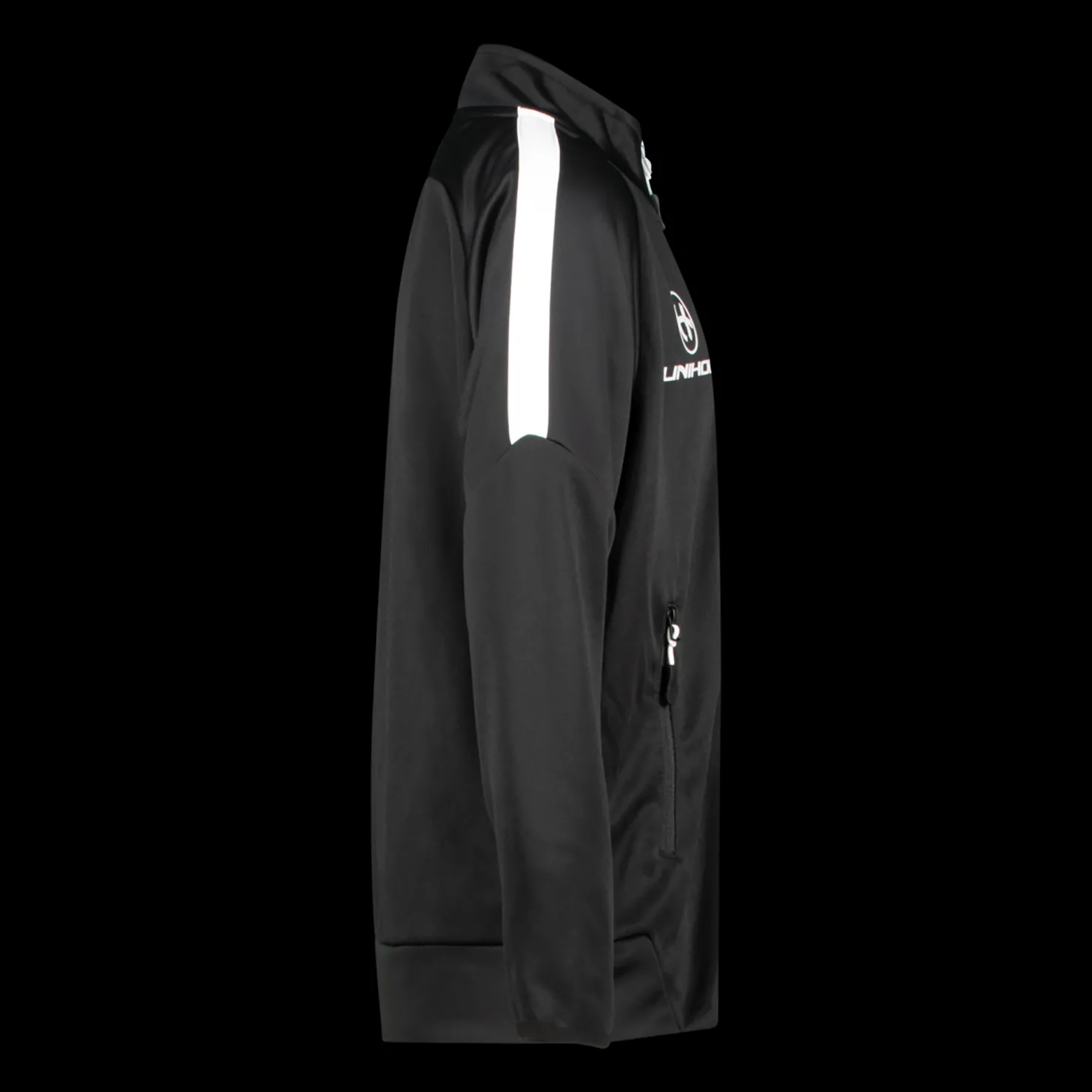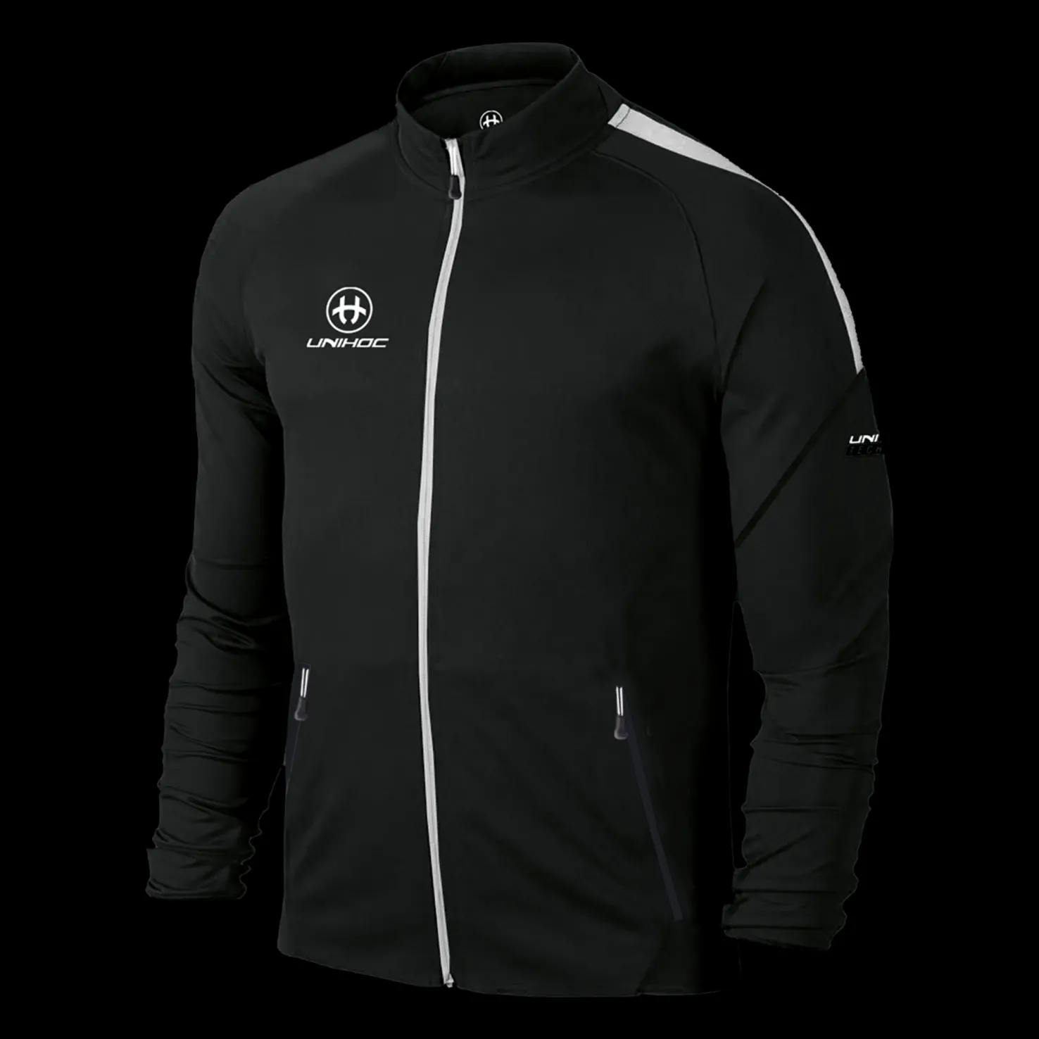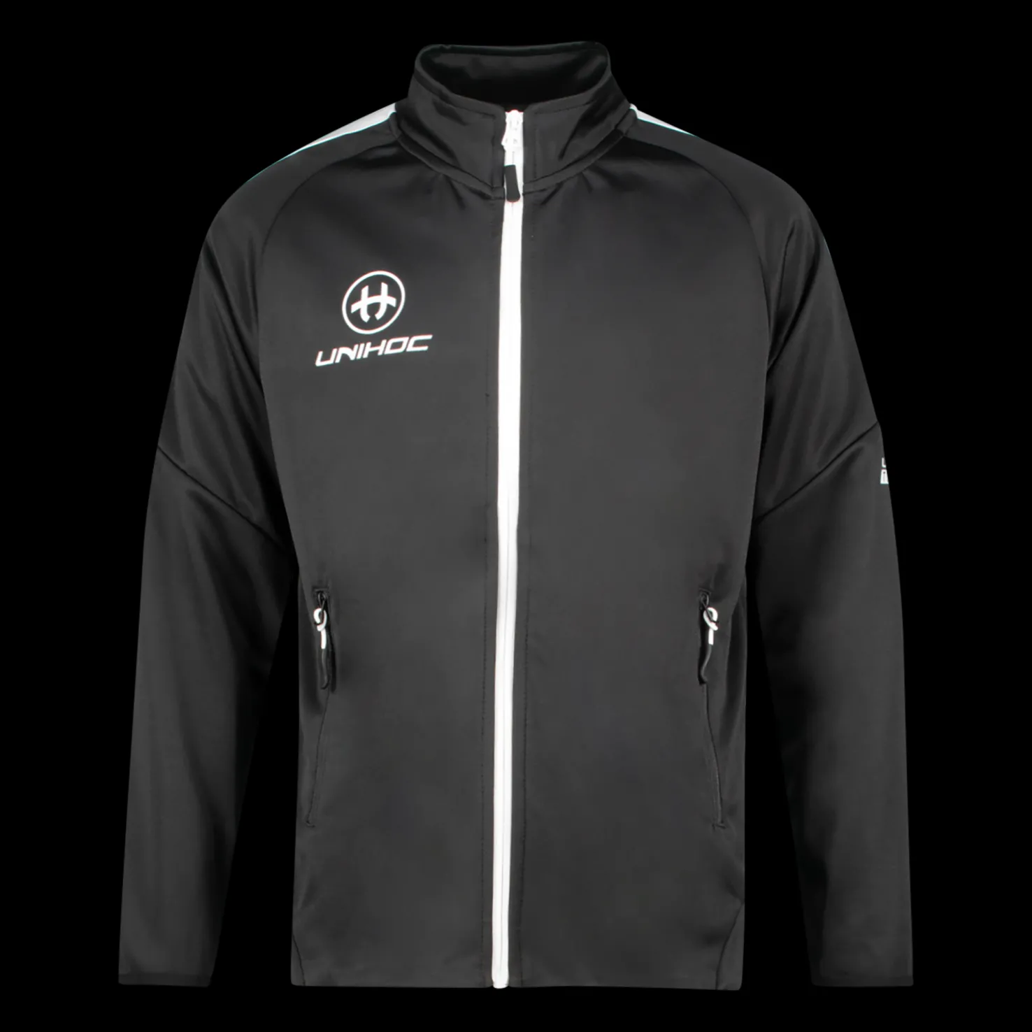 Moderni treenitakki miellyttävää materiaalia. Tasku kummallakin puolella edessä ja Unihoc-logo. Normaali istuvuus.