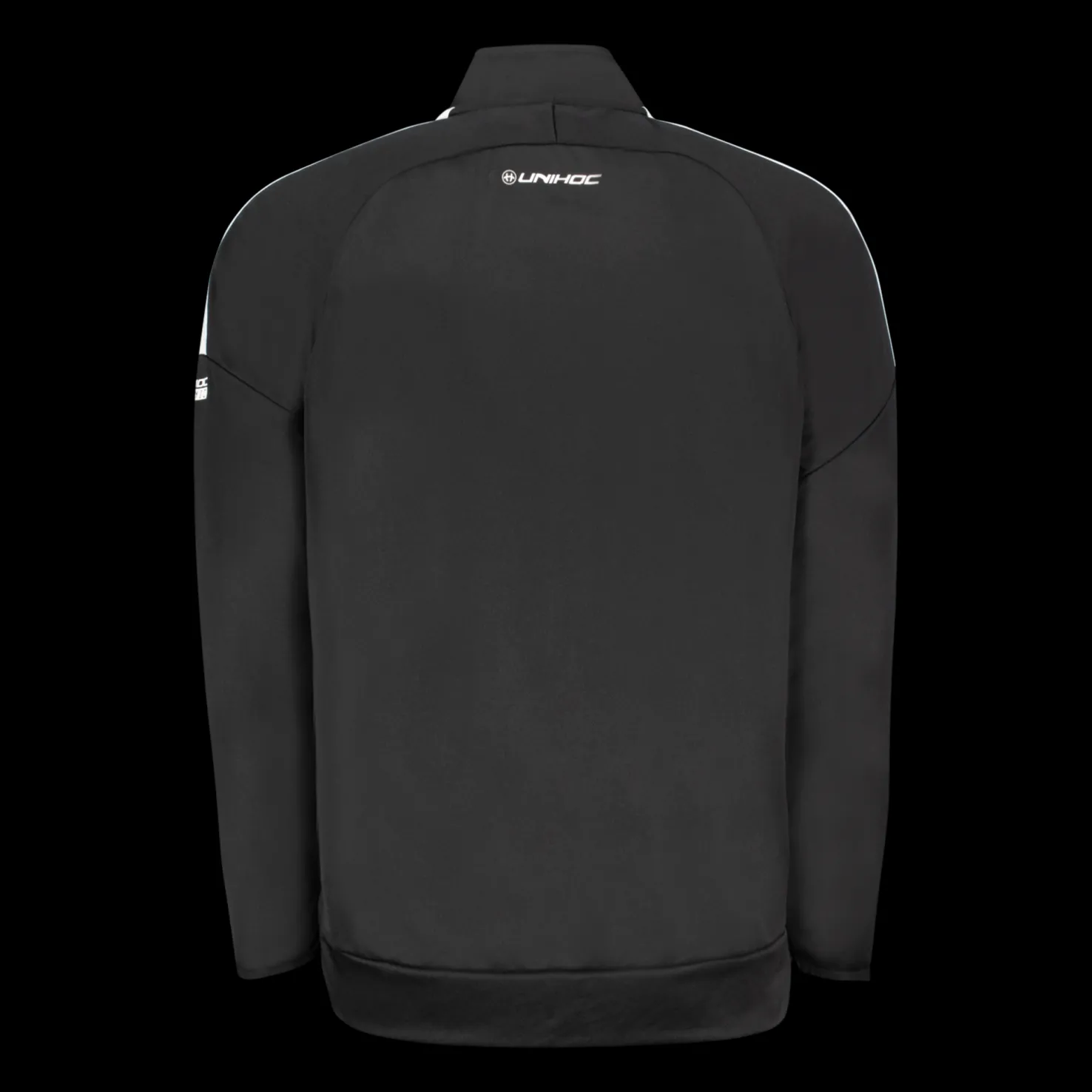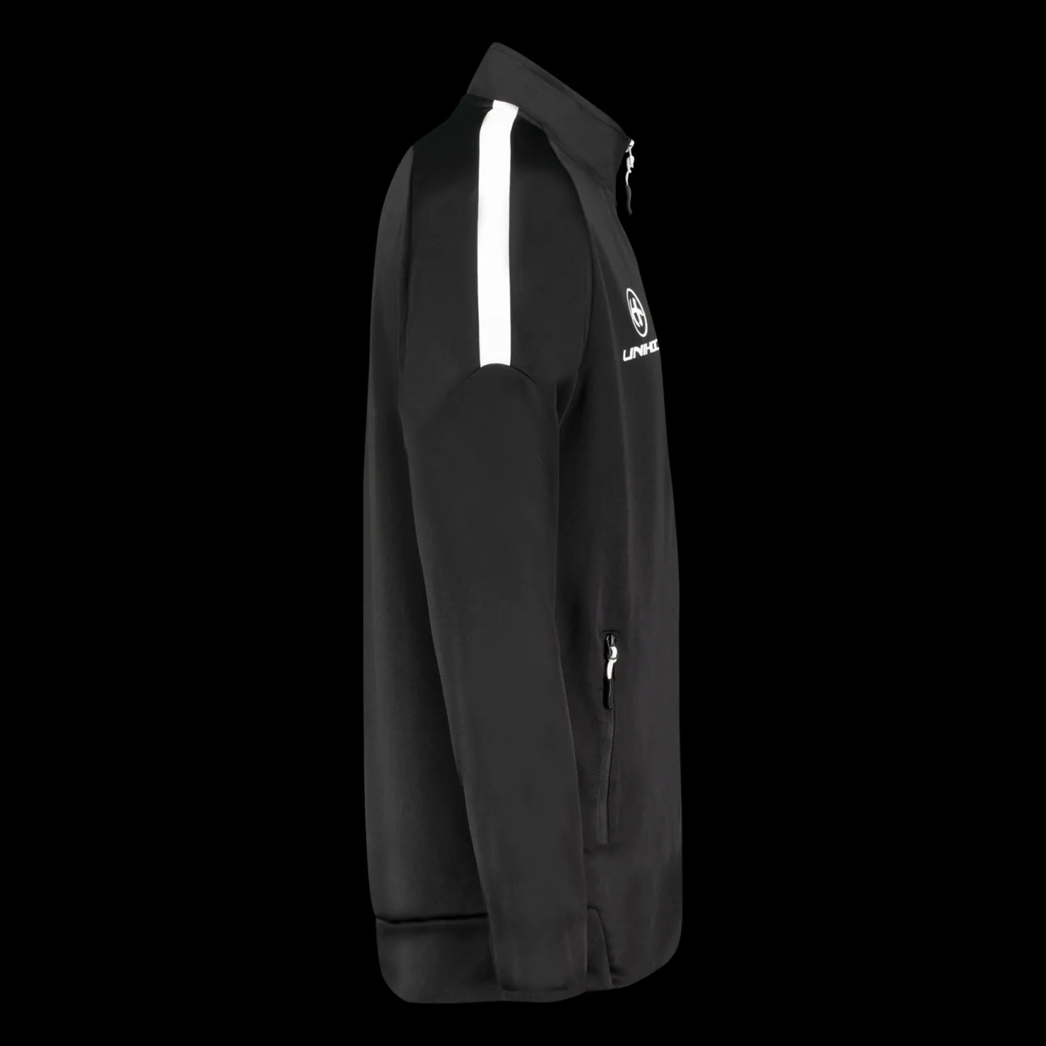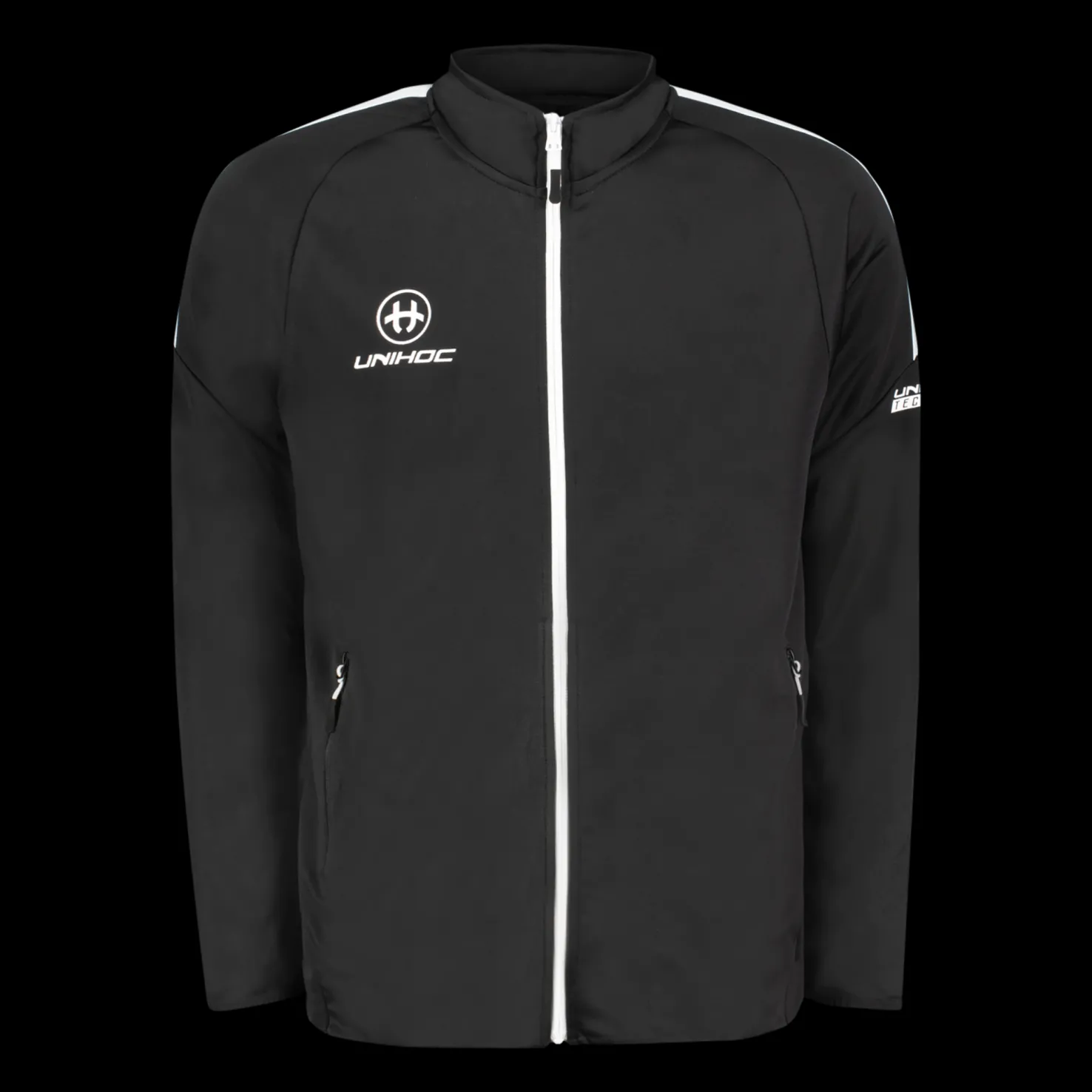 Moderni treenitakki miellyttävää materiaalia. Tasku kummallakin puolella edessä ja Unihoc-logo. Normaali istuvuus.