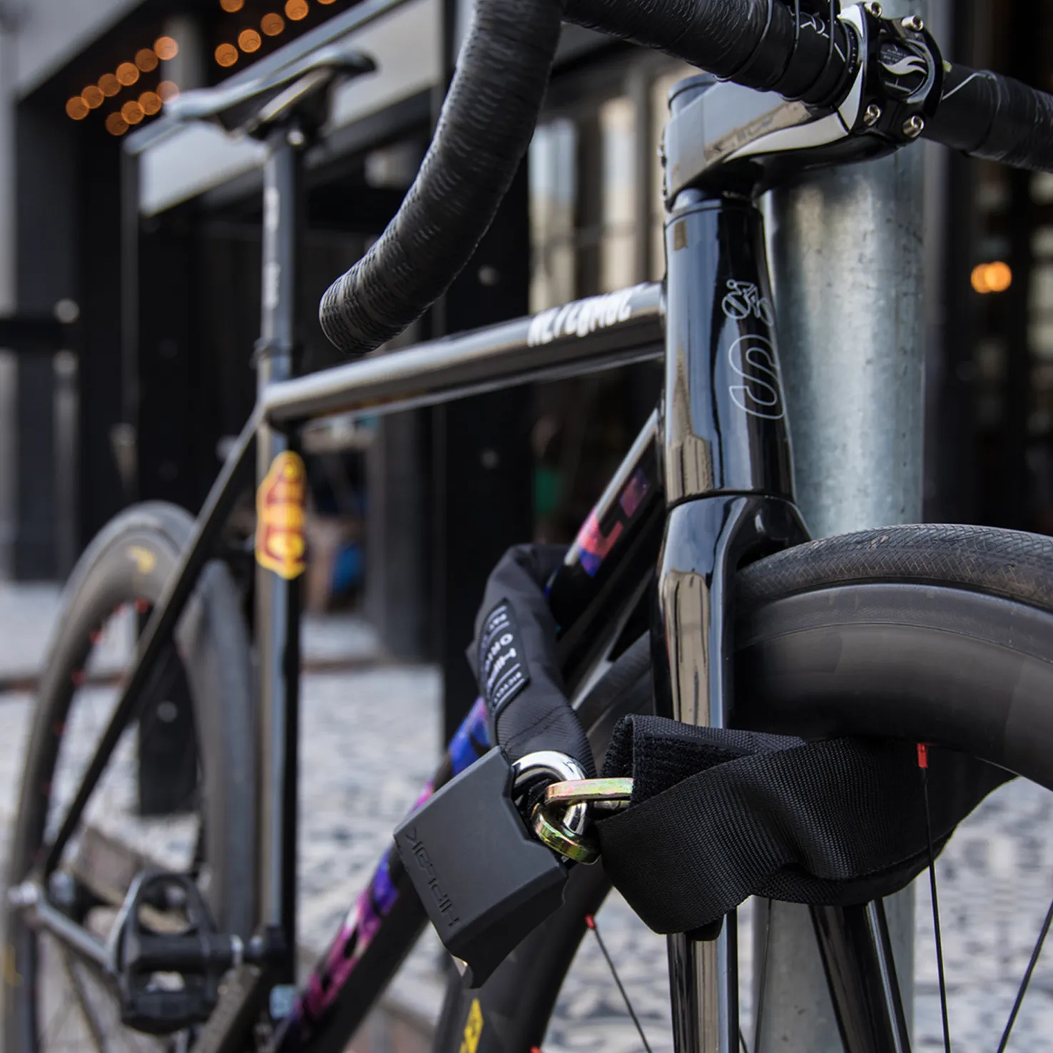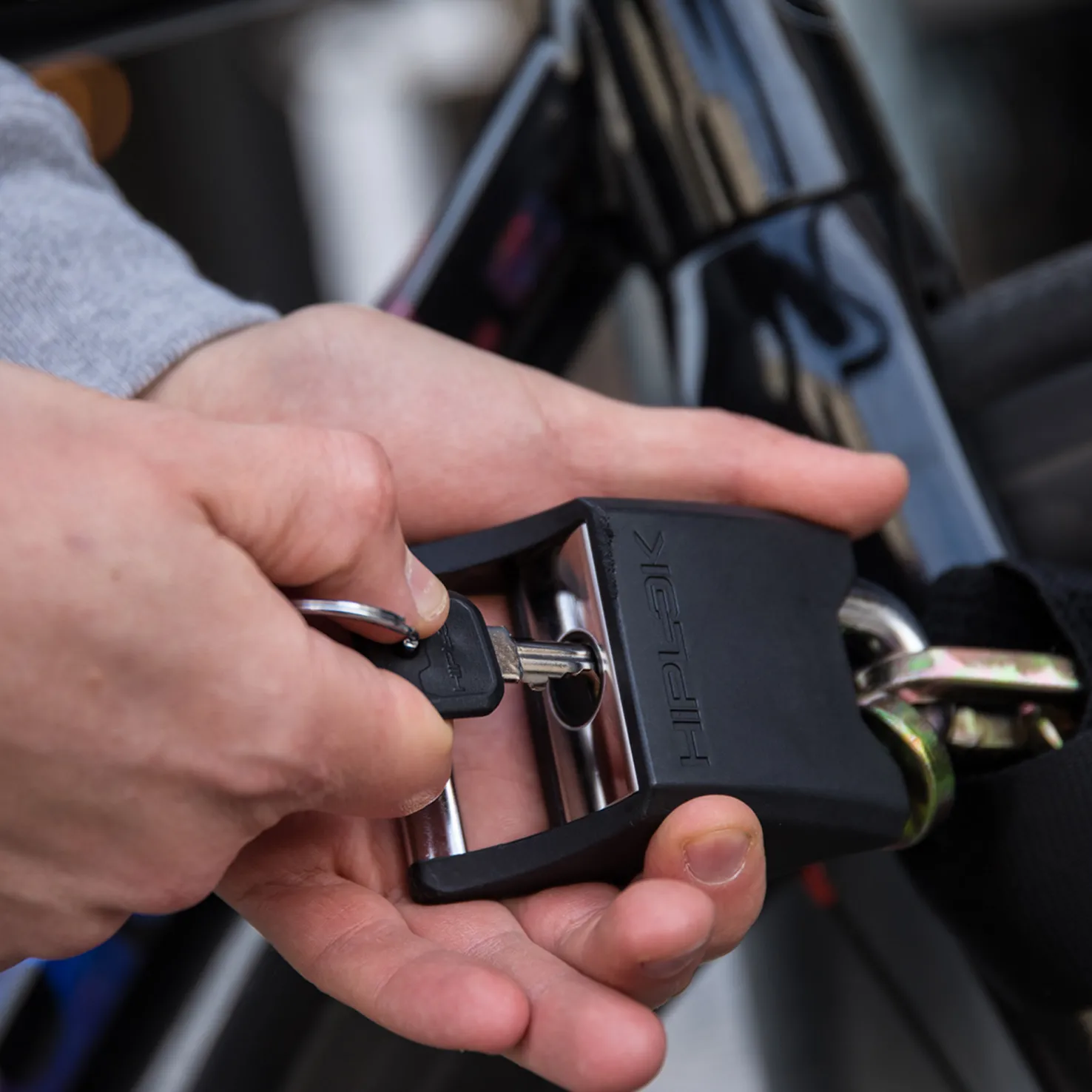 Kulutusta kestävä nailonpäällinen on irrotettava ja pestävä. Hiplok Original sopii kalliisiin pyöriin, jotka joudutaan jättämään varkausriskille erittäin alttiisiin paikkoihin. Mukana 10 mm:n riippulukko, joka on paksua karkaistua terästä.