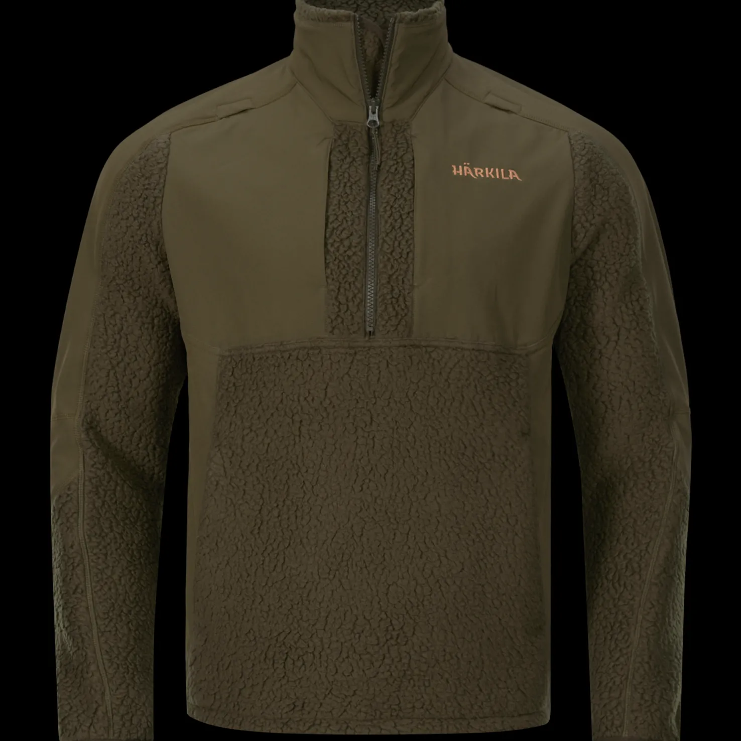 Härkila Polar 1/2 Zip -fleecepuserossa on hihoissa, olkapäissä, rinnassa ja kyljissä kestävät joustopaneelit, jotka parantavat istuvuutta. Lisäksi siinä on kaksi taskua ja rinnassa kaksi radiotaskua, joissa on aukot antenneille.