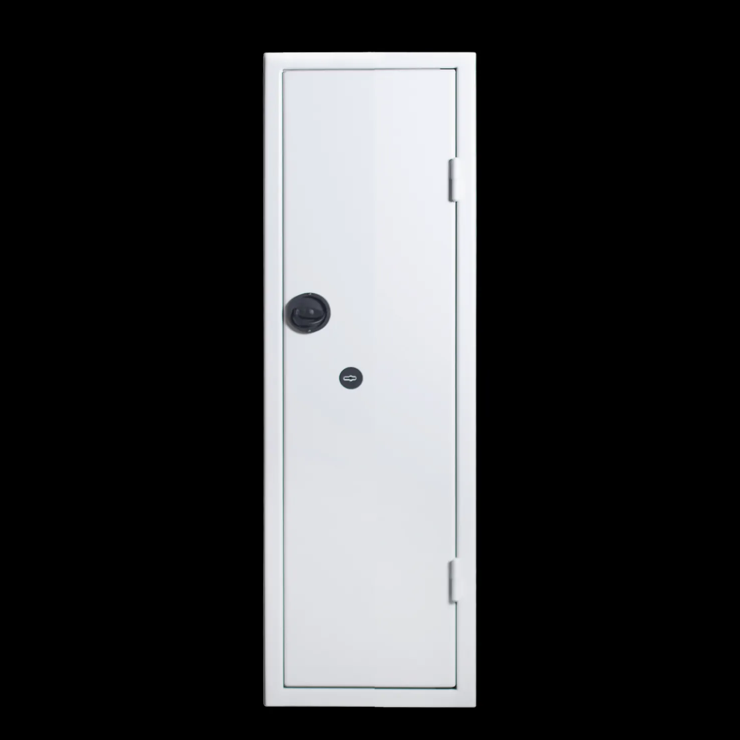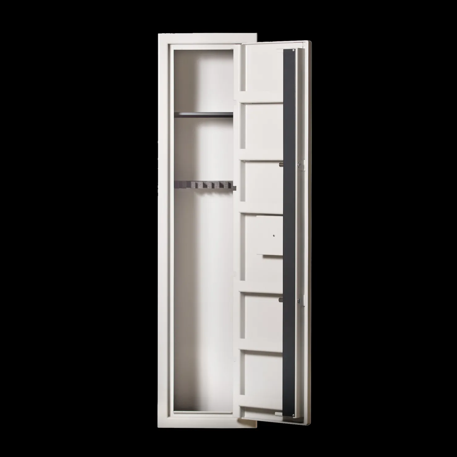 Tyyppi-hyväksytty asekaappi, jossa on iso ylähylly ja 9 kivääripidikettä. Kaapissa on lisäksi 6 isoa ovihyllyä, joissa on runsaasti tilaa pienille käsiaseille ja varusteille.
