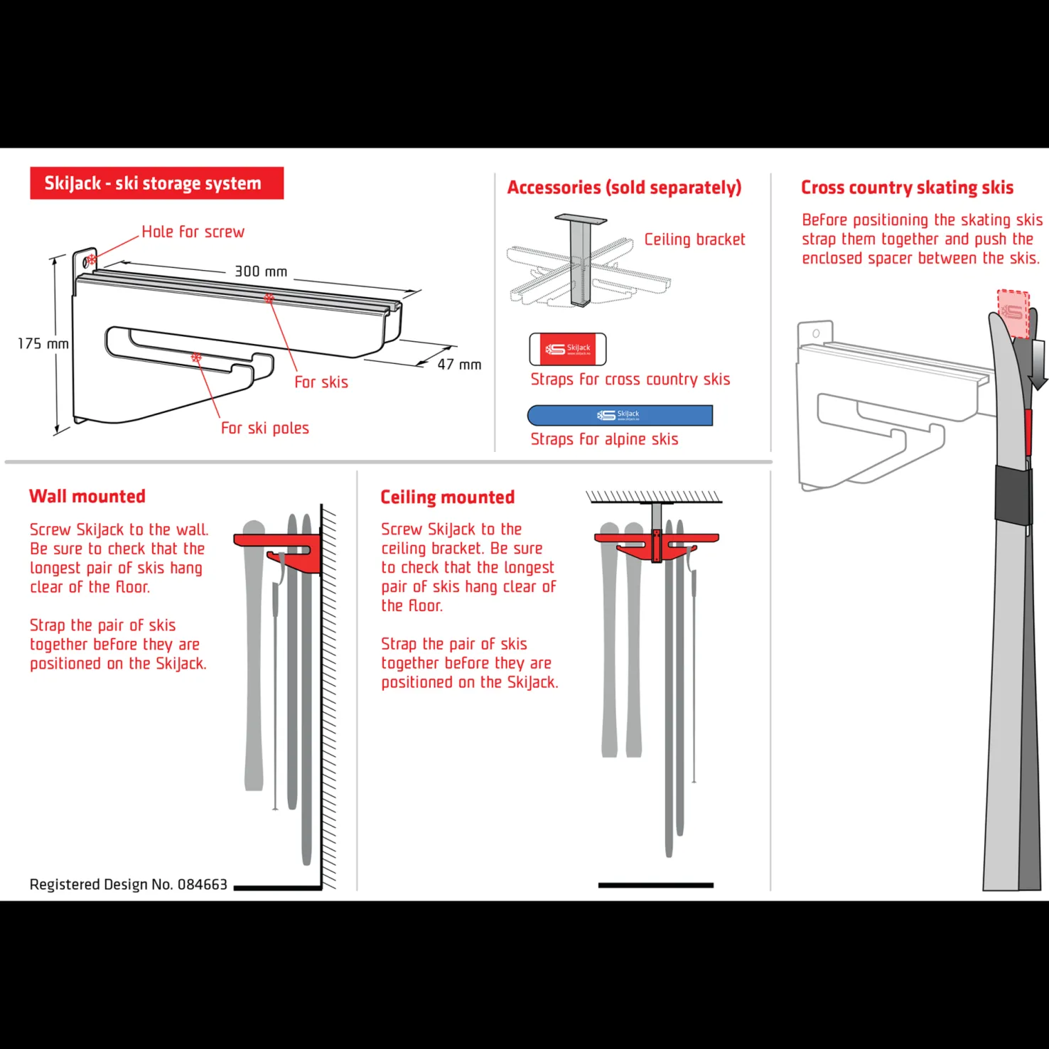 SkiJack hyödyntää tilaa enemmän syvyys- kuin leveyssuunnassa Se on helppo kiinnittää seinään kahdella ruuvilla, ja se vie seinätilaa vain 5 cm:n leveydeltä. Lisävarusteena on saatavilla kattokiinnike, johon mahtuu neljä SkiJack-telinettä ja joka voidaan kiinnittää varaston tai autotallin kattorakenteisiin.