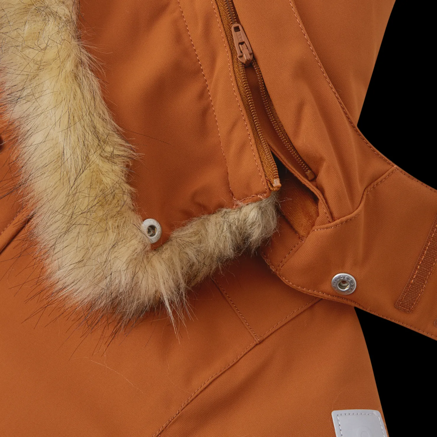 Irrotettava huppu, jossa irrotettava tekoturkis suojaa kylmältä ja tuulelta. Siinä on painonappikiinnitys ja se irtoaa helposti, jos se tarttuu johonkin kiinni ja on sen vuoksi turvallinen, kun lapset leikkivät ulkona.