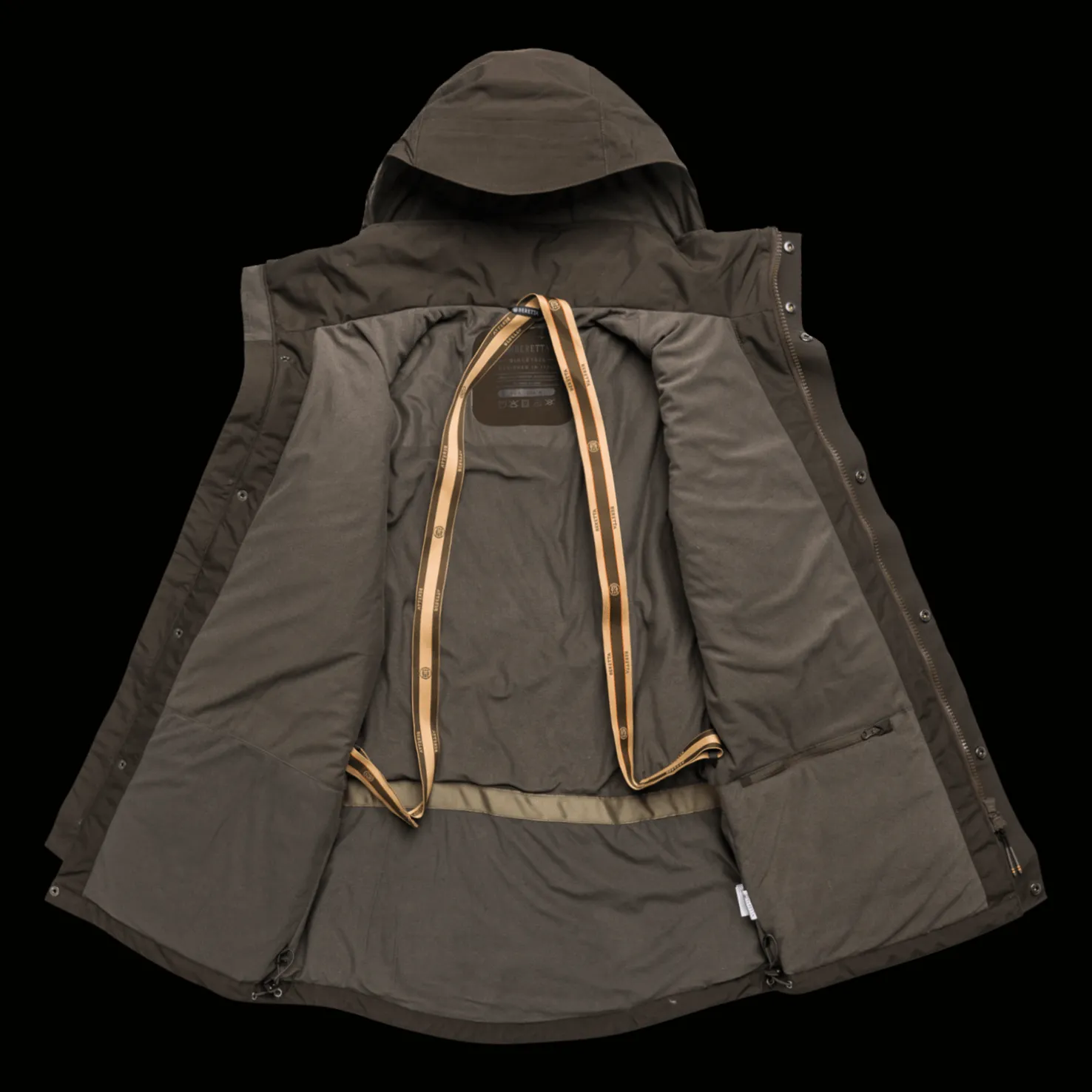BWB EVO – Beretta Waterproof Breathable EVO:n, joustavalla saumalla varustetun kalvon, ansiosta takki on sekä vedenpitävä että hengittävä. DWR-käsitelty: Durable Water Repellent – viimeistely.