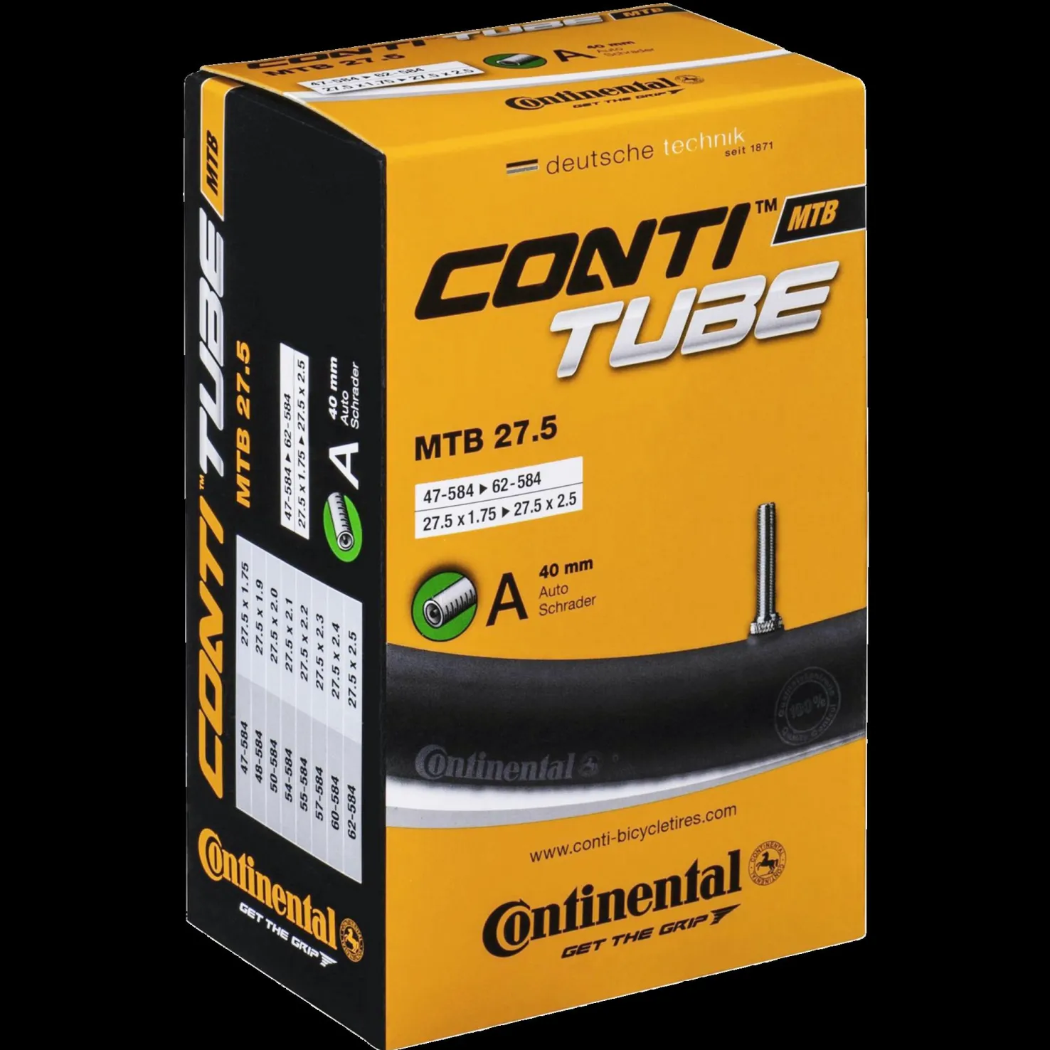 Laadukas Schrader-venttiilillä varustettu sisärengas. Sisärengas on saumaton ja vulkanoitu, renkaassa on tasainen pyöreys sekä erinomainen luotettavuus venttiilin kiinnityskohdassa. Tuotetiedot: – Koko: 27,5'', 47-584 > 62-584