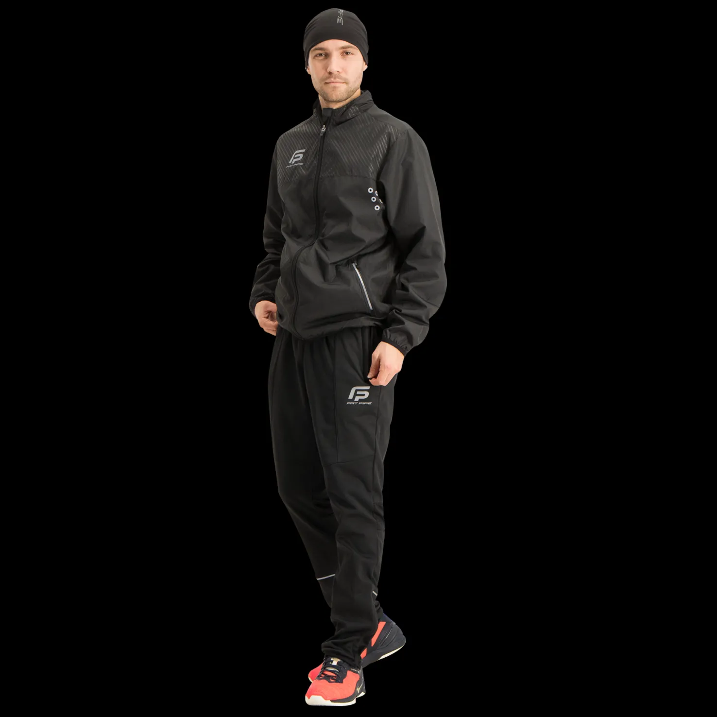 Mukavat treenihousut, joissa joustava vyötärönauha ja säädettävä nyöri. Edessä vetoketjulliset säilytystaskut. Heijastavat yksityiskohdat. Vetoketju lahkeensuissa.