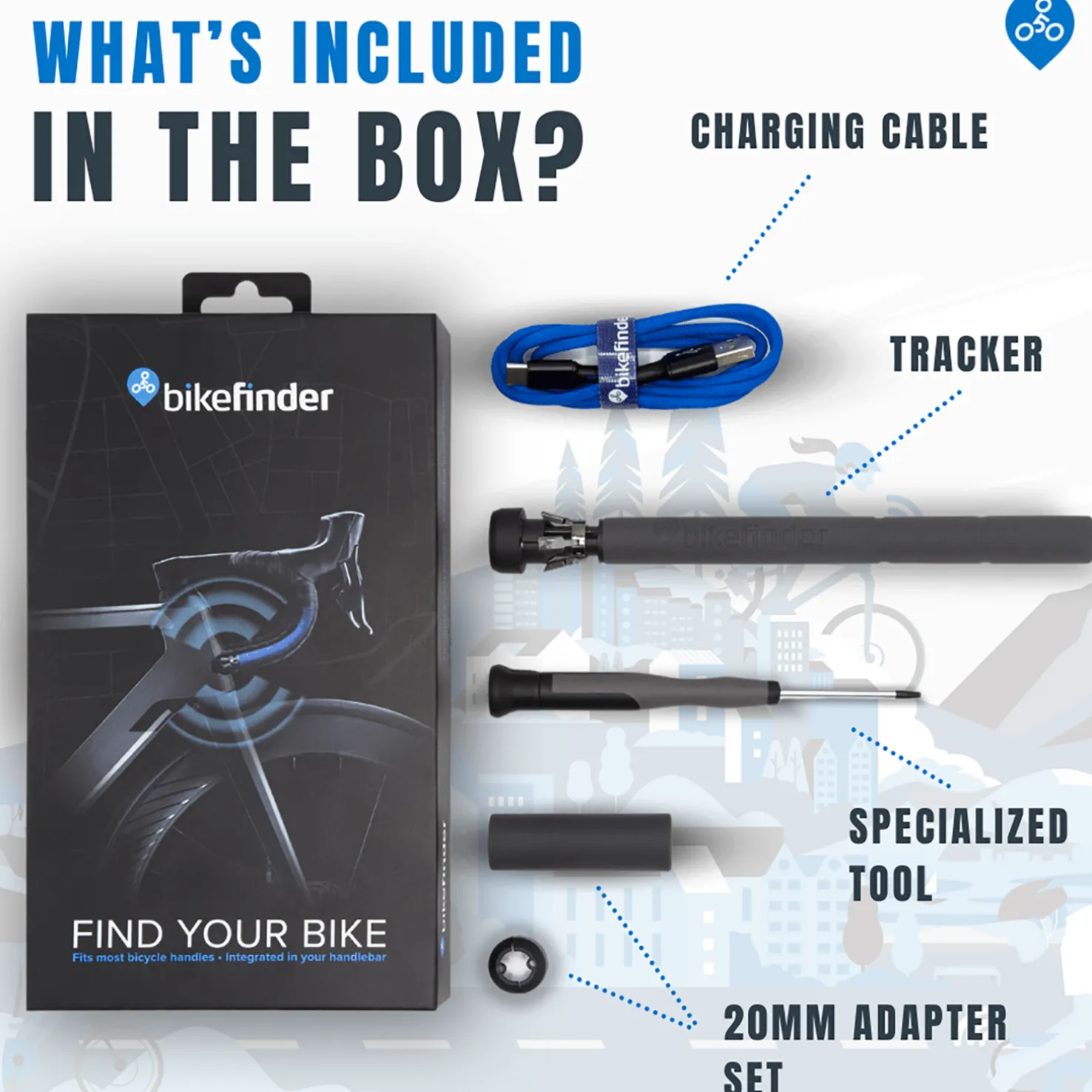Nykyaikainen GPS/GSM- ja Bluetooth®-tekniikkaa käyttävä paikannusratkaisu ja vapaaehtoinen vakuutus polkupyörille. BikeFinder integroidaan polkupyörän ohjaustankoon ja kiinnitetään ainutlaatuisella kiinnitysmekanismilla. Varkaiden on lähes mahdotonta poistaa laitetta. Tuote aktivoidaan ostamalla tilaus vakuutuksella tai ilman vakuutusta osoitteessa www.bikefinder.com.