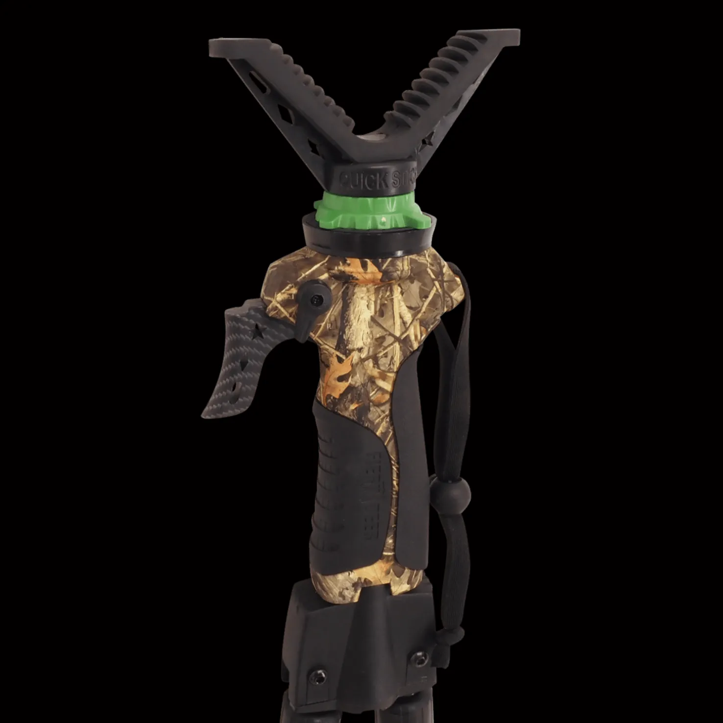 Bipod Shooting Stick -ampumatuessa on uusi ja kumitettu kahva, joka takaa hyvän otteen myös märkänä. Jalkojen leveys tekee tuesta turvallisen ja vakaan alustasta riippumatta.