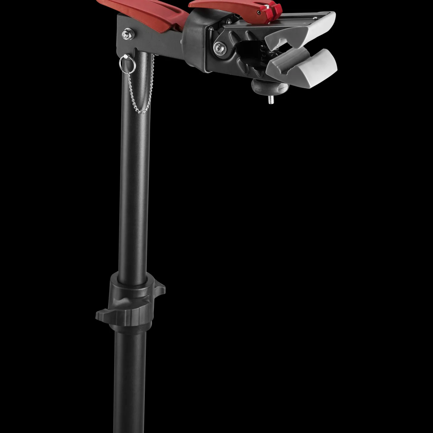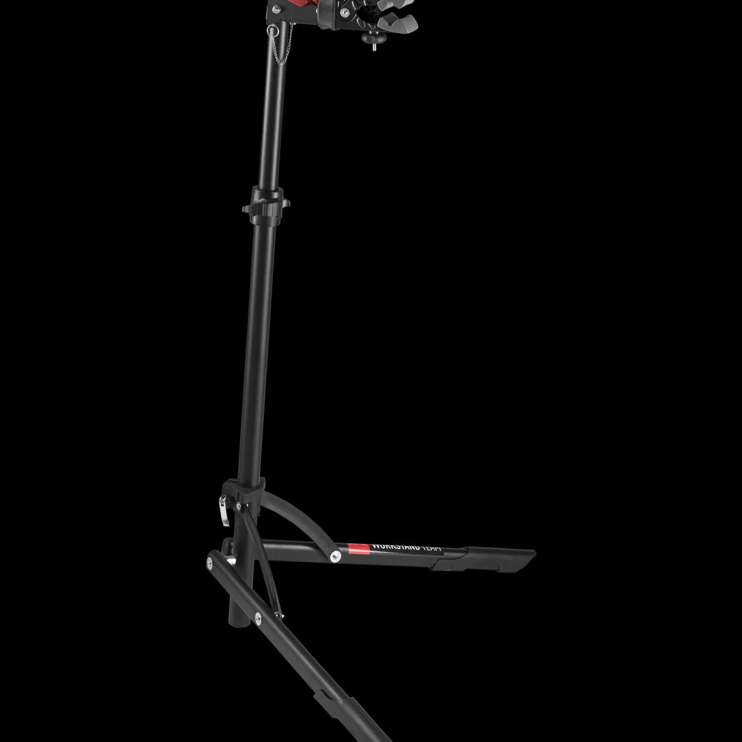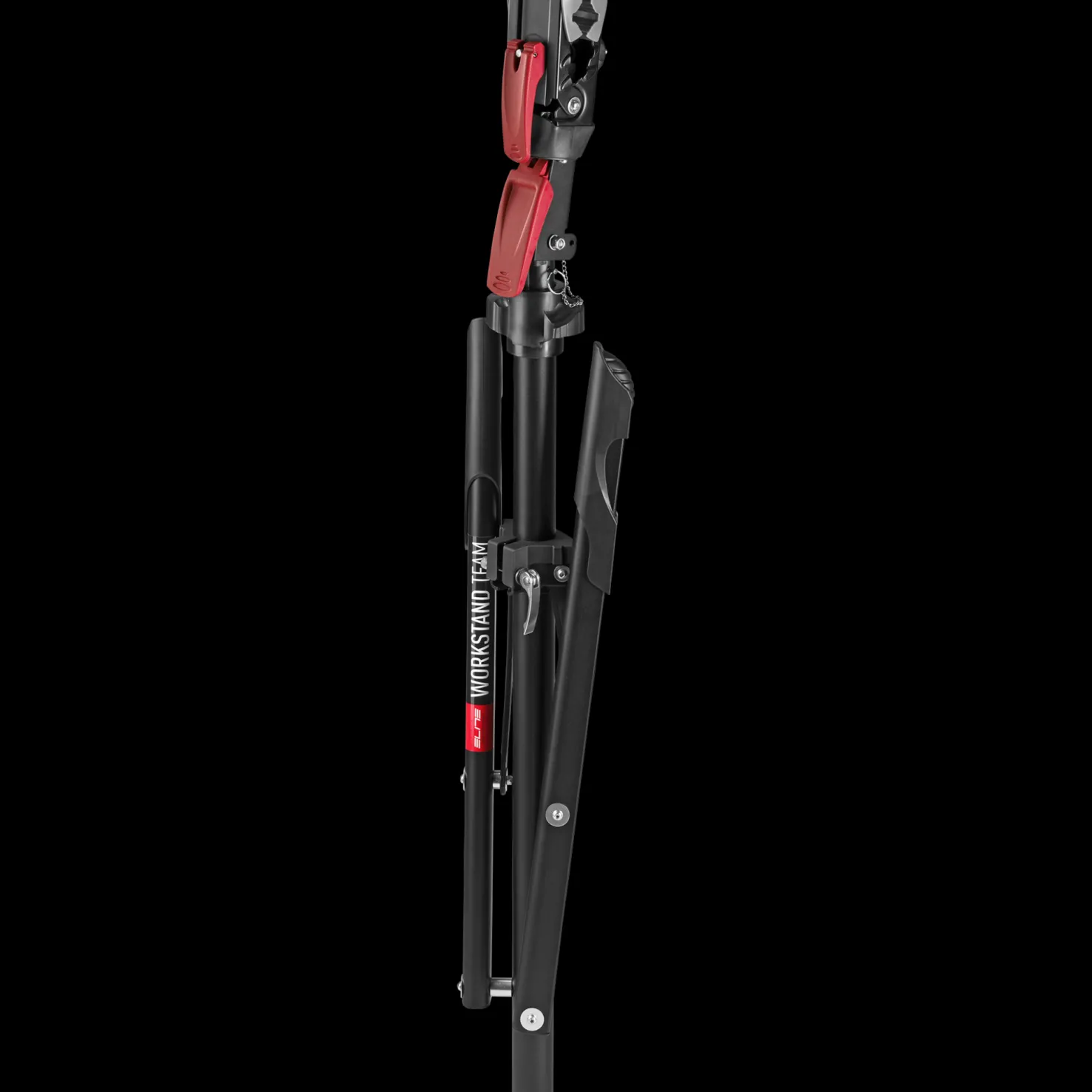 Elite Team Repairstand sopii kaikille pyörille, on tukeva ja sen korkeus on säädettävä. Naarmuttamattomia puristimia voi kiertää 360 astetta.