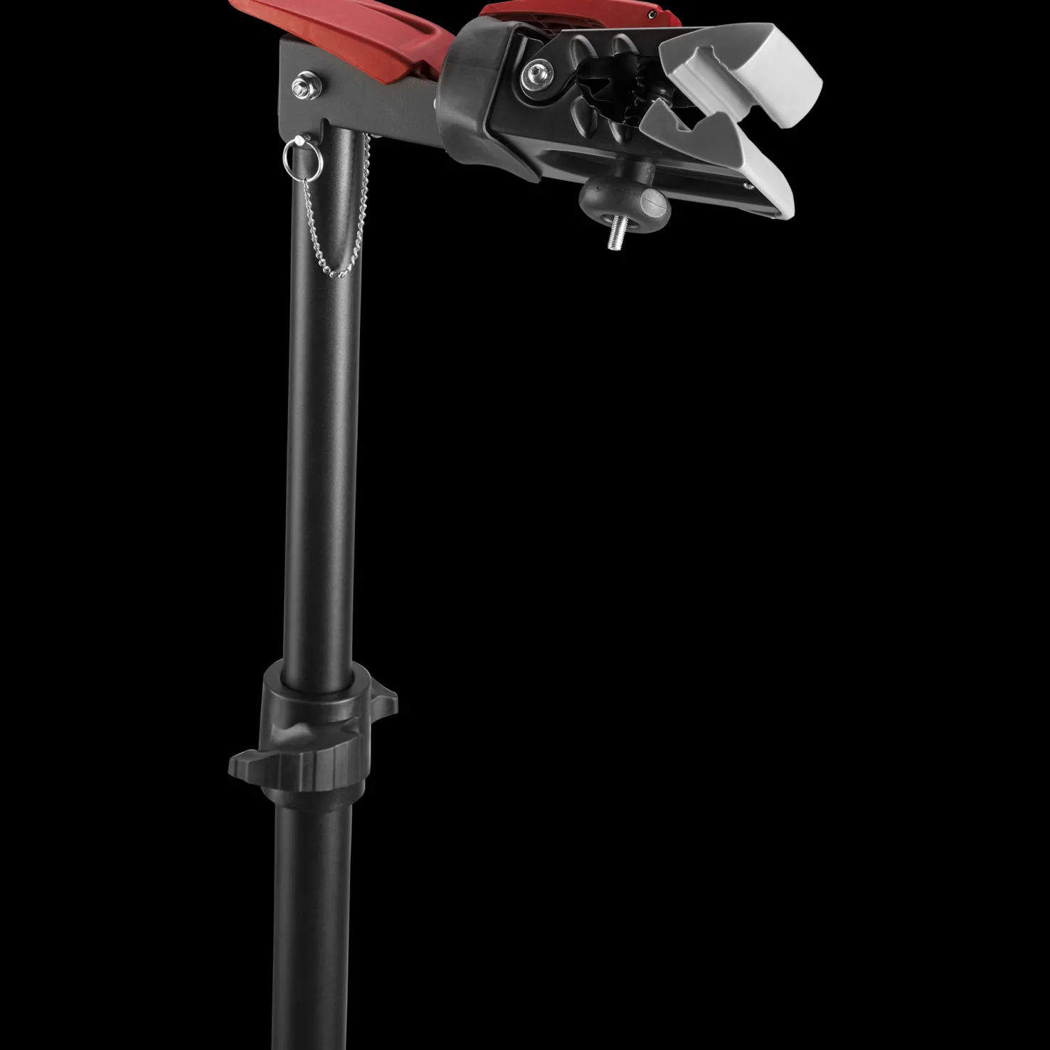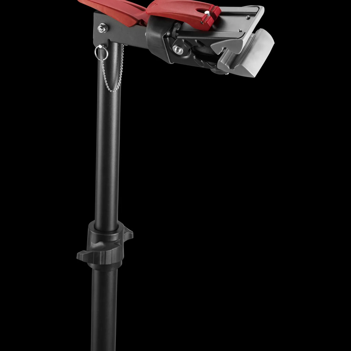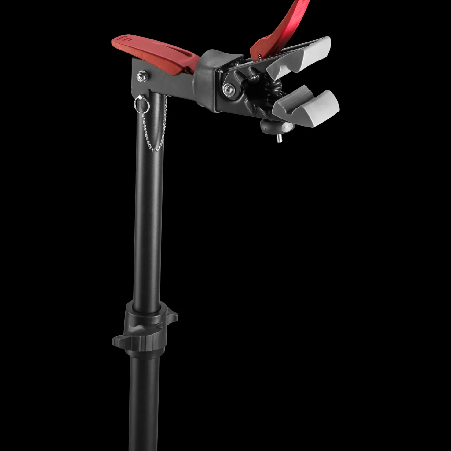 Elite Team Repairstand sopii kaikille pyörille, on tukeva ja sen korkeus on säädettävä. Naarmuttamattomia puristimia voi kiertää 360 astetta.
