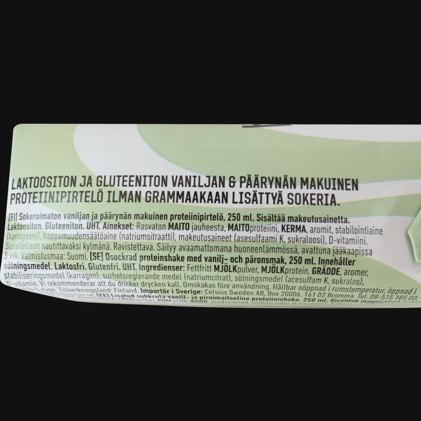 Laktoositon ja gluteeniton proteiinipirtelö, maustettu vaniljalla ja päärynällä. Ilman lisättyä sokeria Täydellinen treenin jälkeiseen palautumiseen.