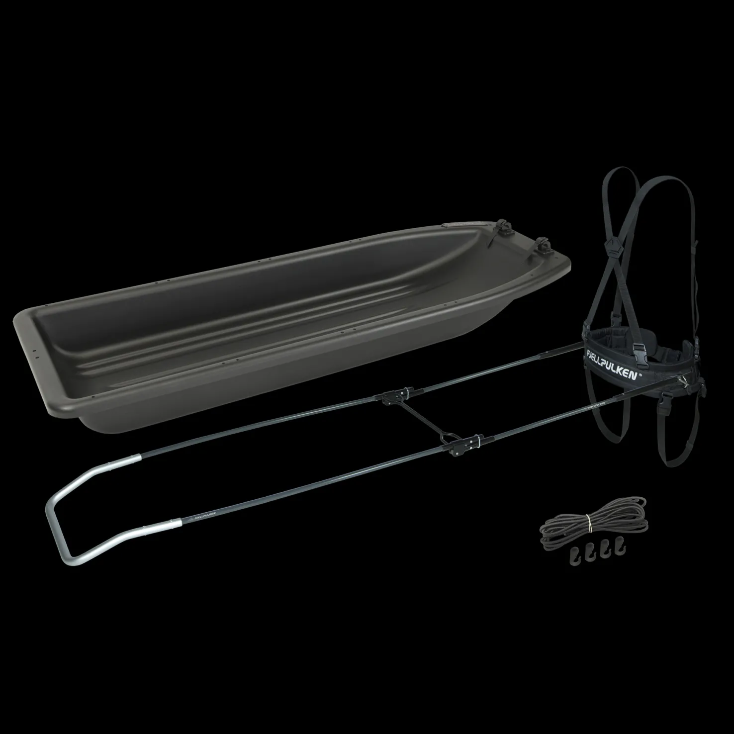 Mukana Fjellpulkenin vakiomalliset kokoontaittuvat vetoaisat ja Fjellpulkenin vakiomalliset vetovaljaat. Kokoontaittuvat vetoaisat helpottavat kuljettamista ja säilyttämistä.