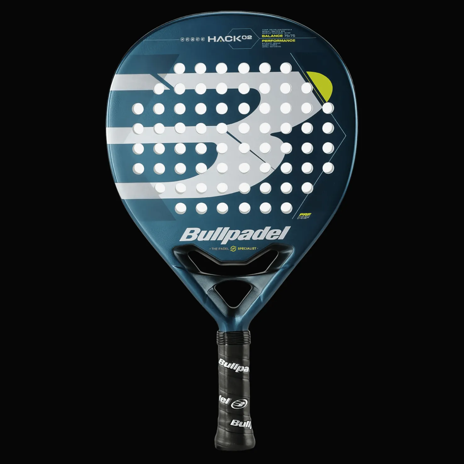 Bullpadel Hack 02 Prf 24 on padelmaila, jossa on hybridirunko, joka tarjoaa maksimaalisen tehon ja korkean suorituskyvyn menettämättä hallintaa.