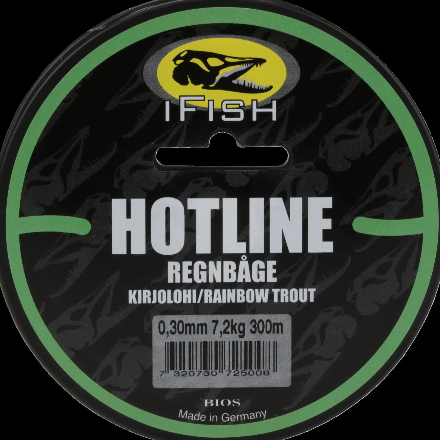 Hotline on 0,30 mm paksu nailonsiima taimenen pyyntiin. Vetolujuus: 7,2 kg. Pituus: 300 m.