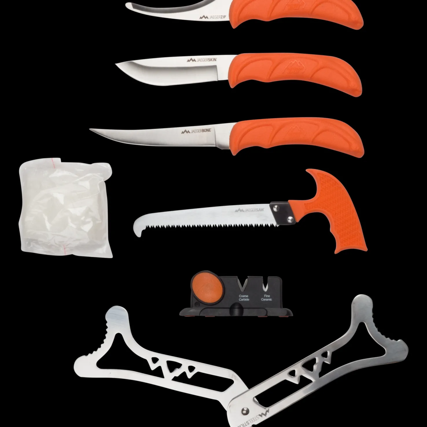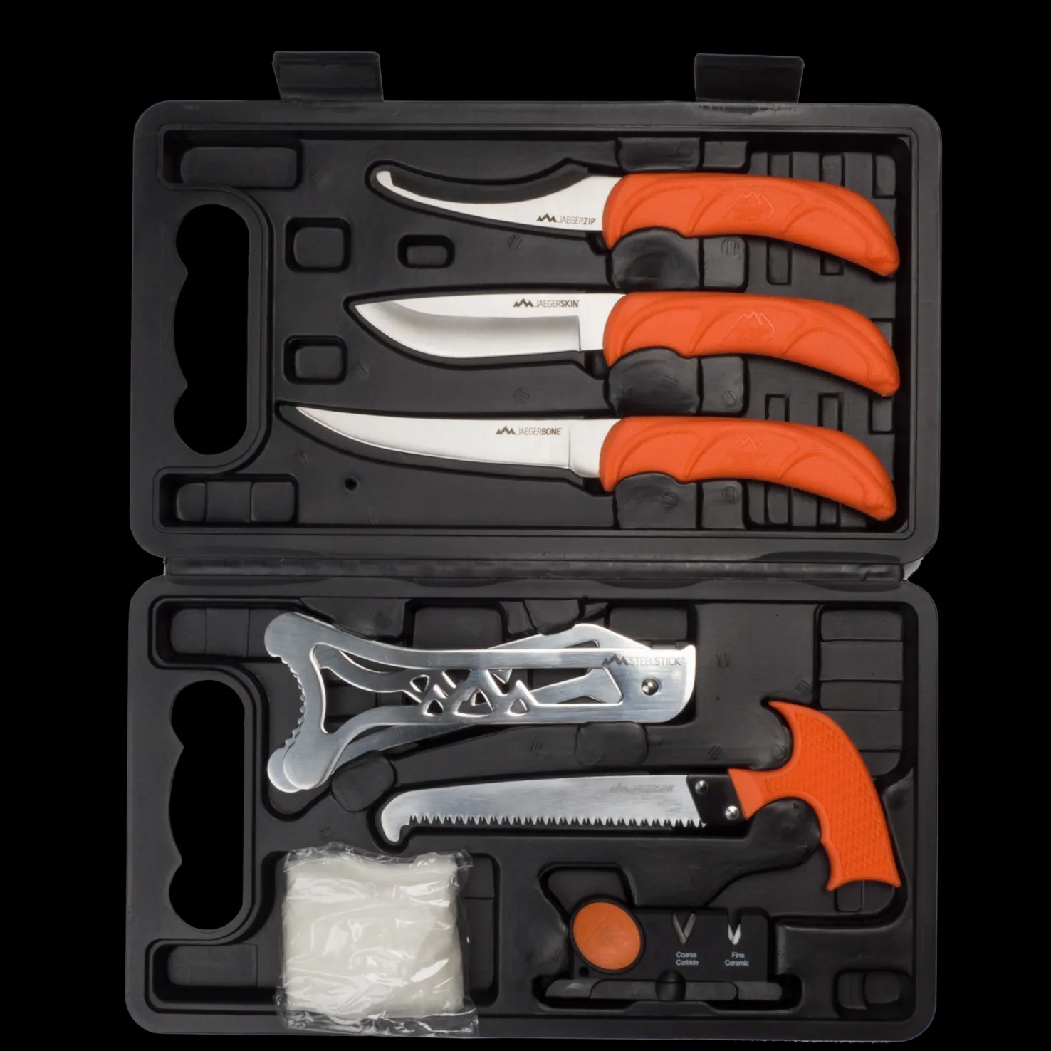 Jaeger on monipuolinen 8-osainen teurastussetti kovamuovisessa säilytysrasiassa. Veitsien terät ovat ruostumatonta 420j2-terästä. Niissä on kumipinnoitetut kahvat, joista saa hyvän otteen myös märkänä.