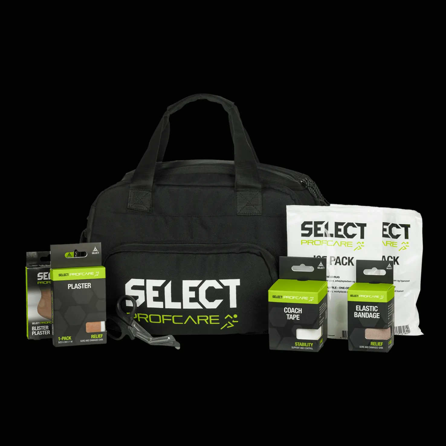 Selectin Medicalbag medium w/content v25 sisältää kaksi kylmäpakkausta, laastarin, kuusi rakkolaastaria, sakset, kaksi rullaa teippiä ja joustavan siteen.