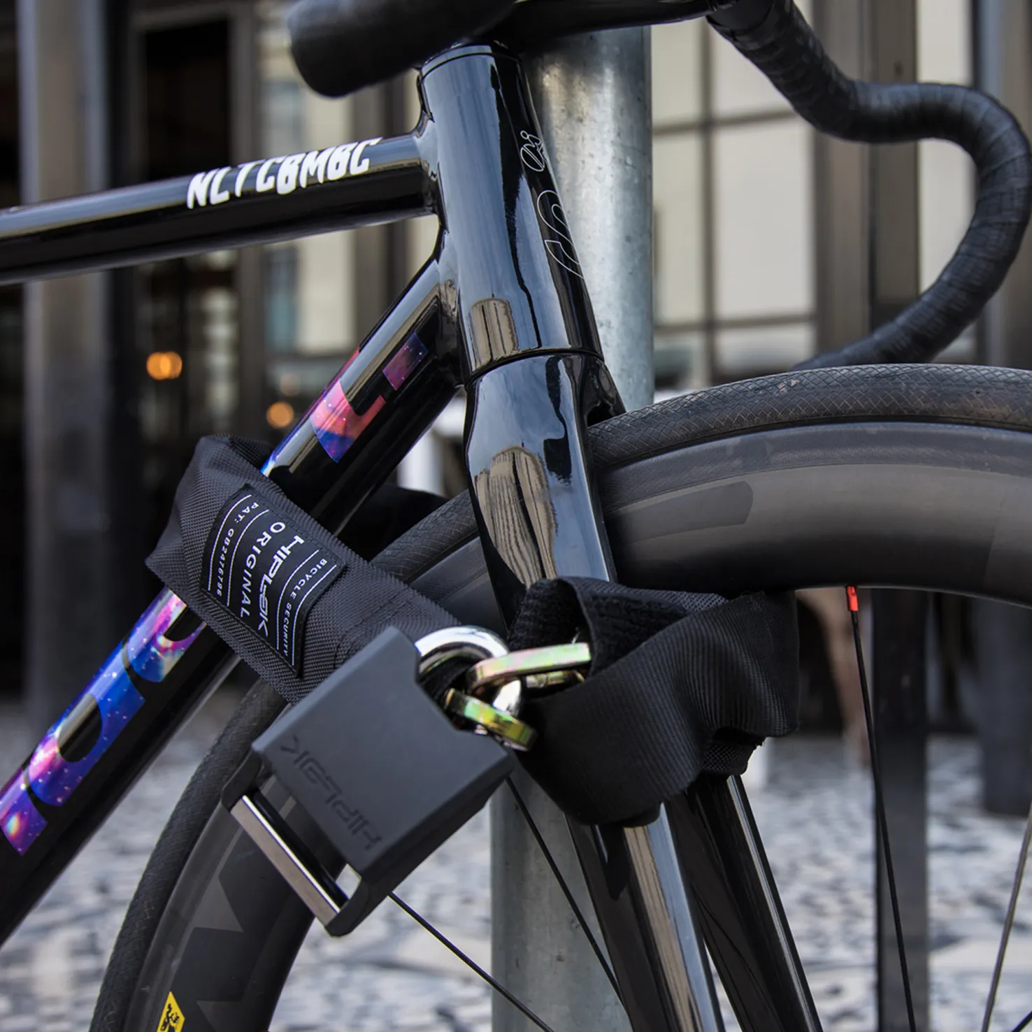 Kulutusta kestävä nailonpäällinen on irrotettava ja pestävä. Hiplok Original sopii kalliisiin pyöriin, jotka joudutaan jättämään varkausriskille erittäin alttiisiin paikkoihin. Mukana 10 mm:n riippulukko, joka on paksua karkaistua terästä.