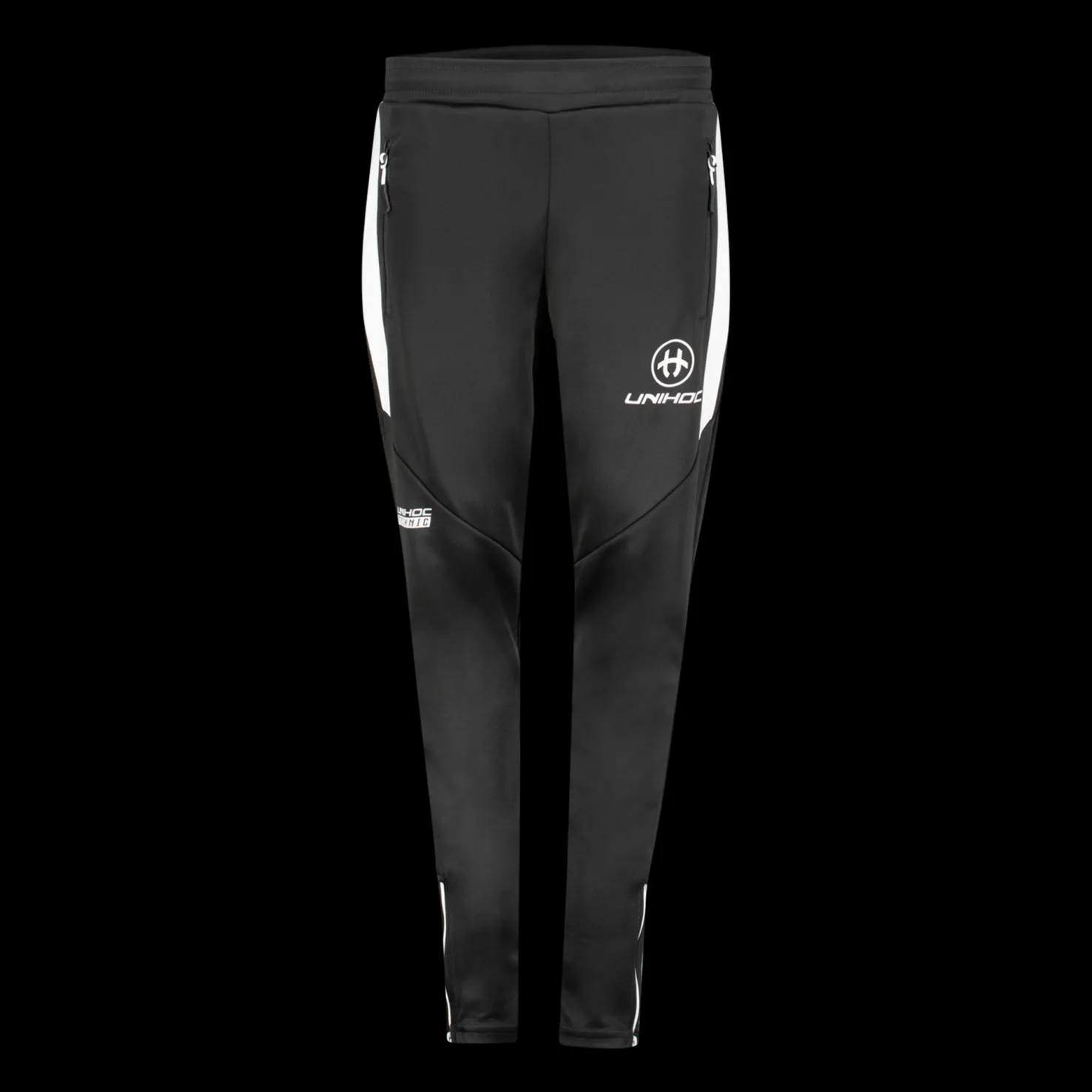 Modernit treenihousut miellyttävää materiaalia. Kummallakin puolella vetoketjutasku. Valkoinen Unihoc-logo oikeassa lahkeessa. Slim fit -malli.