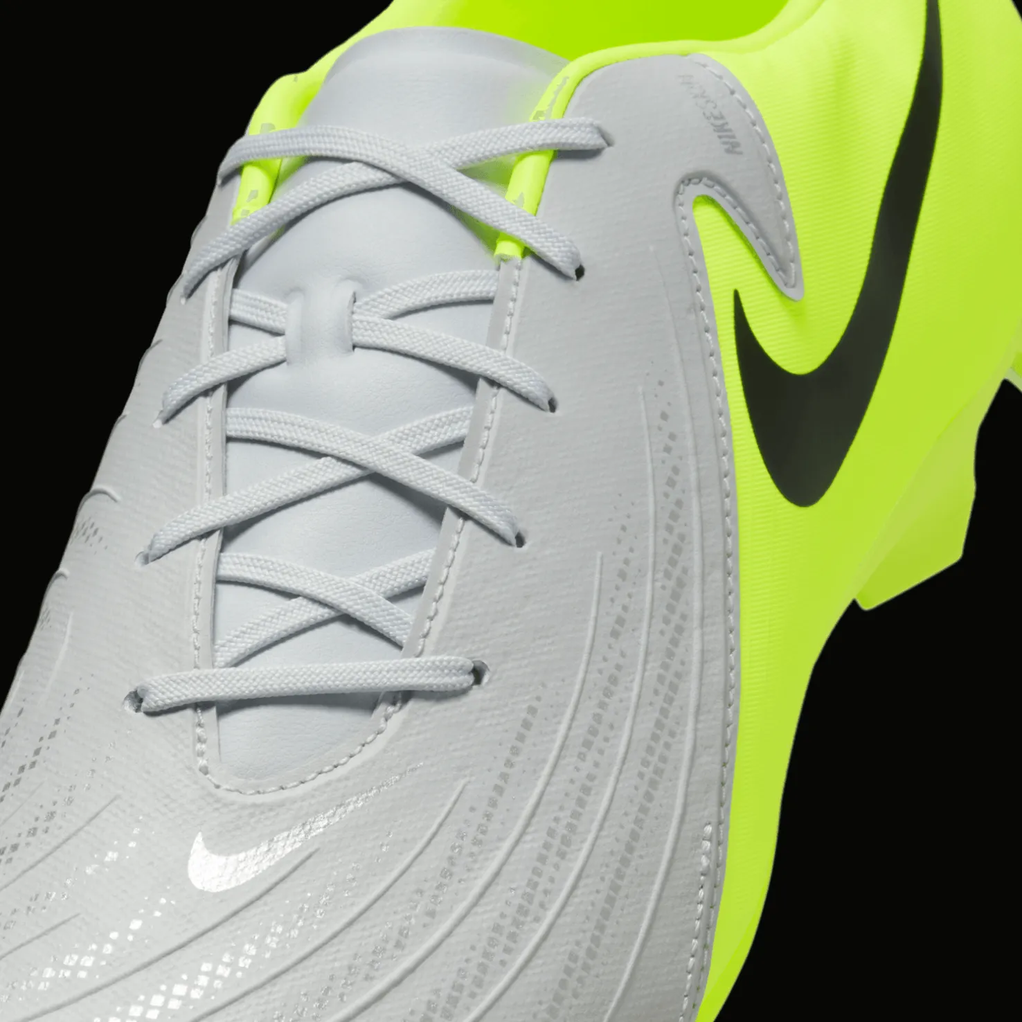 Nike Phantom GX 2 Academy -kengissä on NikeSkin-päällinen, joka takaa optimaalisen pallotuntuman ja pallonhallinnan myös kovemmassa vauhdissa. Tämä tarkoittaa, että verkkopäällisessä on kumipintaisia kohtia optimaaliseen pallonhallintaan.