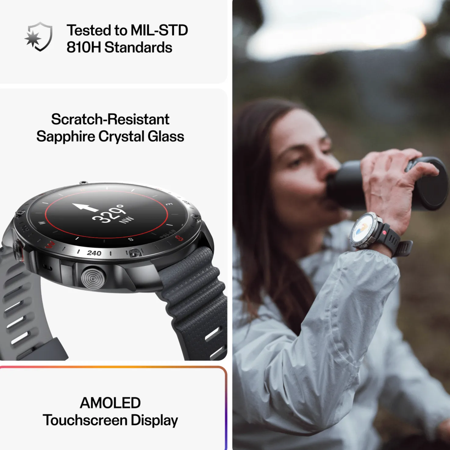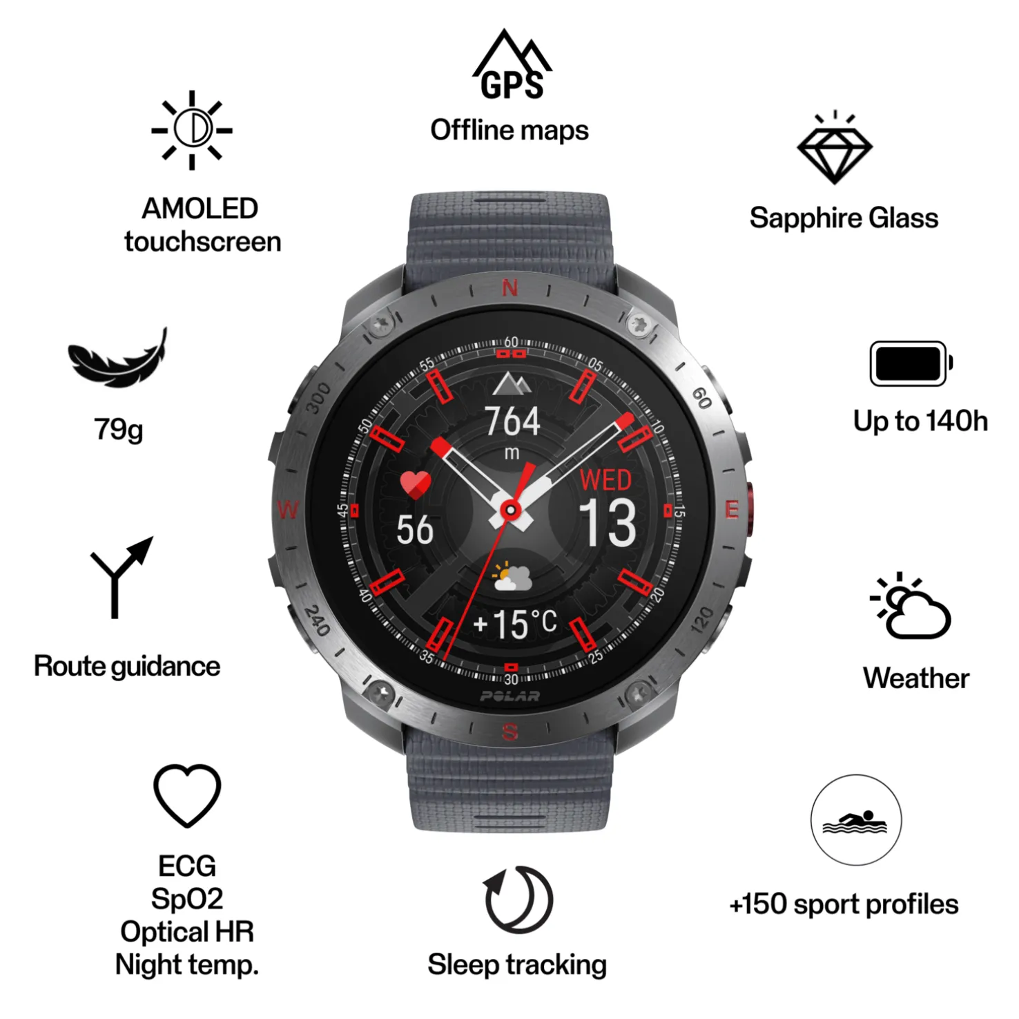 Kestävä ja vahva GPS-urheilukello, jossa on safiirikristallilasista valmistettu korkearesoluutioinen AMOLED-kosketusnäyttö. Treeni- ja palautumistyökalut. Yli 150 käytettävissä olevaa lajiprofiilia. Pitkäkestoinen akku. Bluetooth-liitäntä. Paino: 79 grammaa.