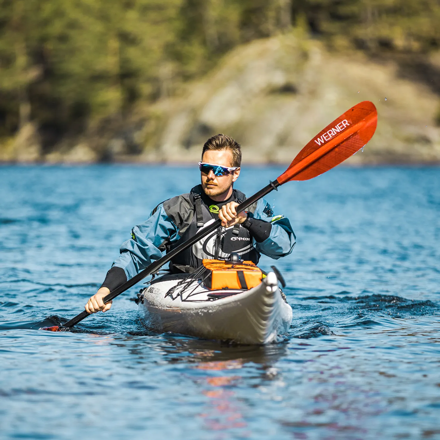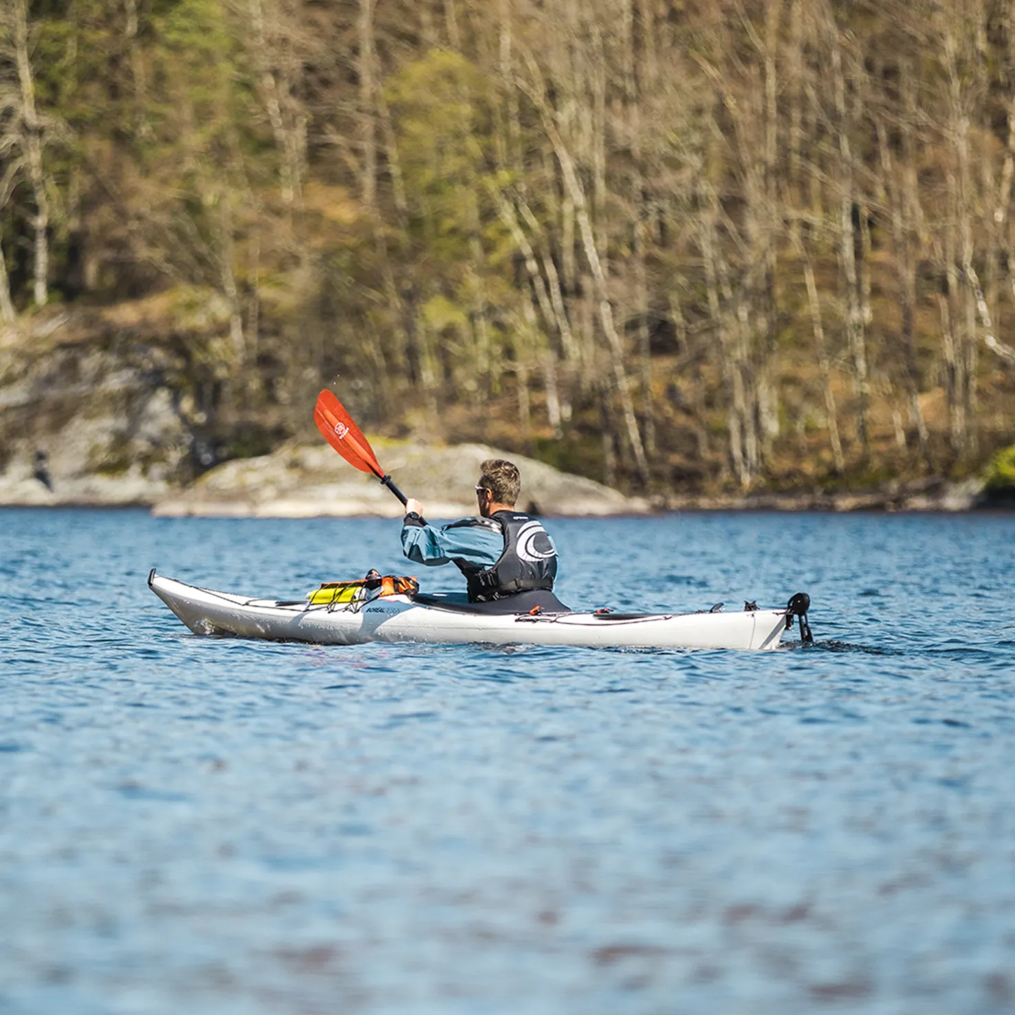 Luotettava ja vedessä tukevasti liikkuva kajakki, jossa on peräsin ja evä.