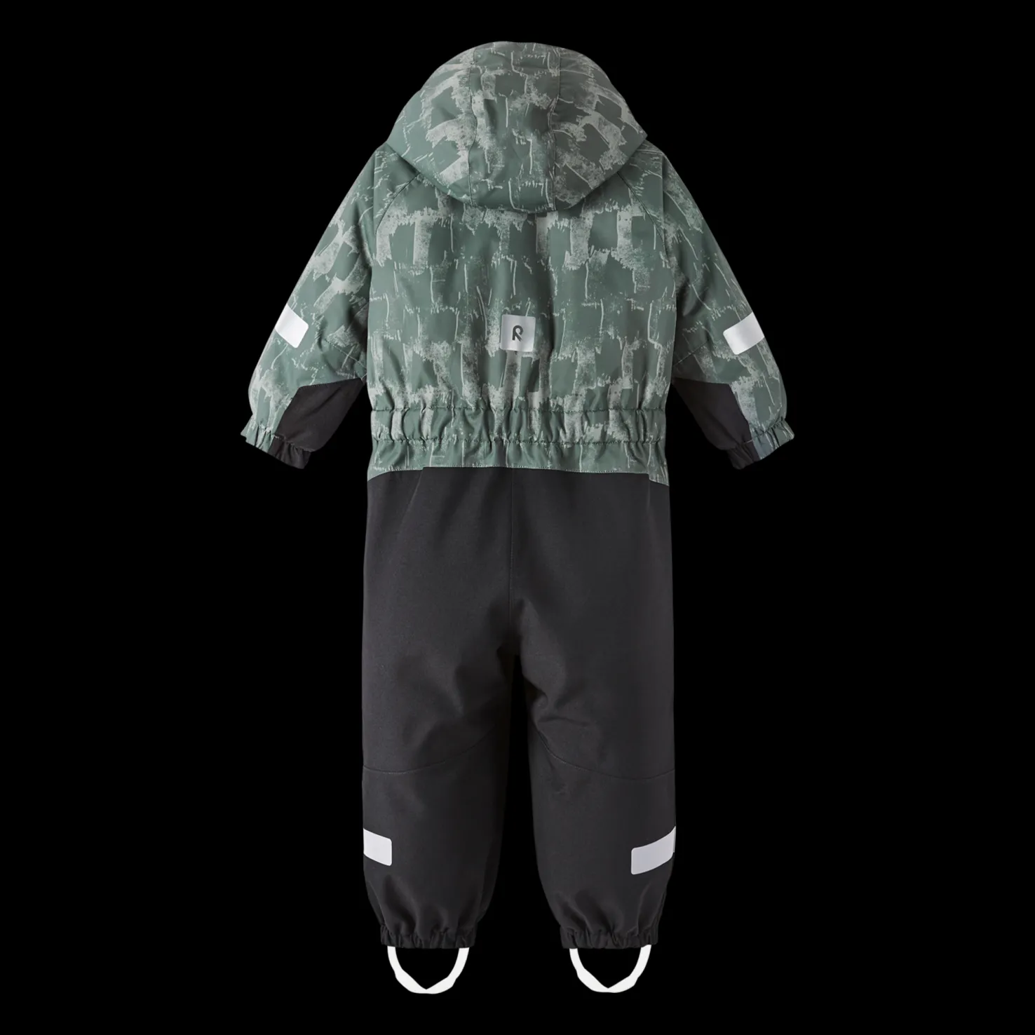 Huppu on irrotettava ja painonapit irtoavat helposti, jos se juuttuu johonkin. Irrotettavat silikoniset jalkalenkit, jotka on helppo kiinnittää kengän alle niin, että haalari pysyy paikallaan.