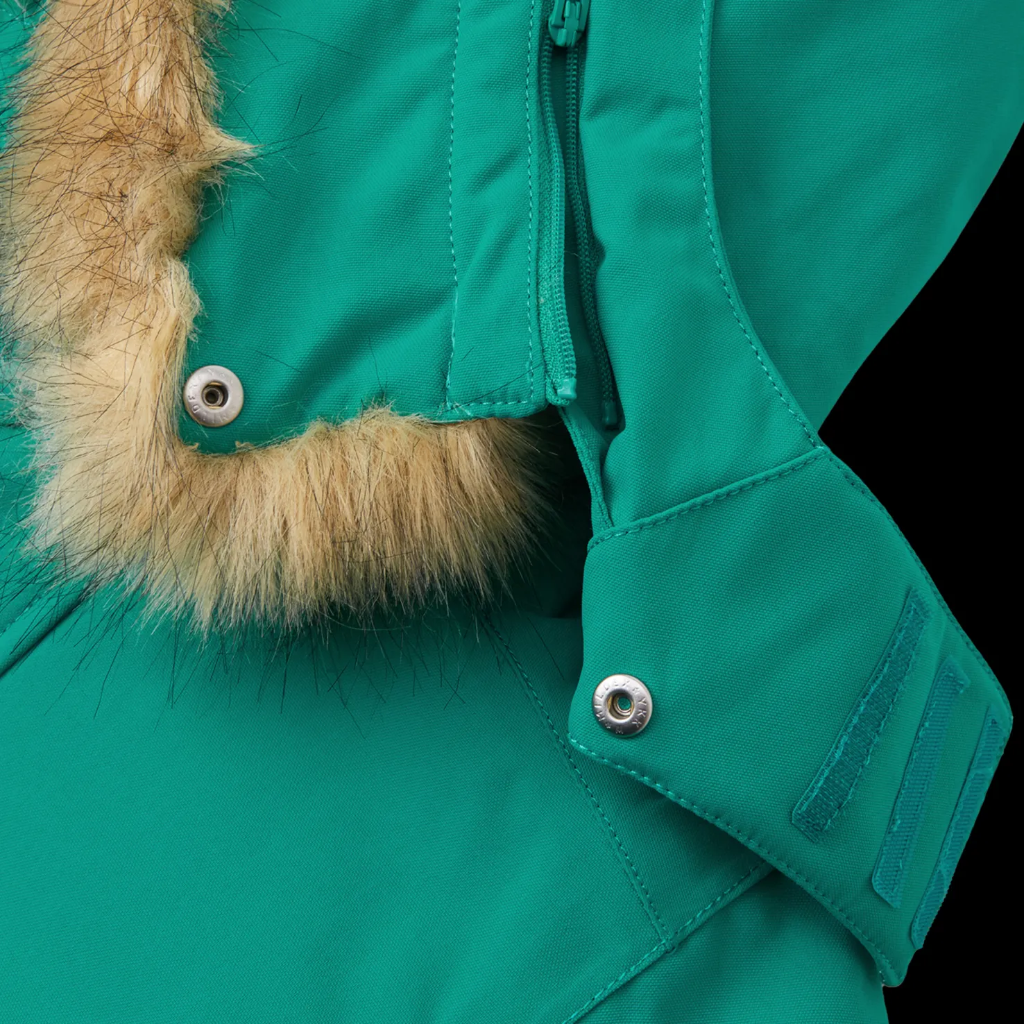 – Huppu: Painonapeilla kiinnitetty, irrotettava, säädettävä, joustava, irrotettava tekoturkis