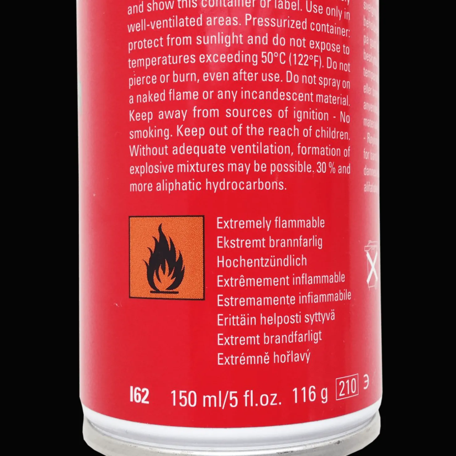 Painesäiliö. Suojeltava auringonvalolta eikä saa altistaa yli 50 asteen lämpötilalle. Ei saa puhkaista tai polttaa vaikka se olisi tyhjäkin. Ei saa käyttää avoimen tulen eikä hehkuvien materiaalien lähellä. Pidetään etäällä syttyvistä aineista – tupakointi kielletty. Säilytetään lasten ulottumattomissa. Ei saa altistaa yli 300 asteen lämpötilaan.