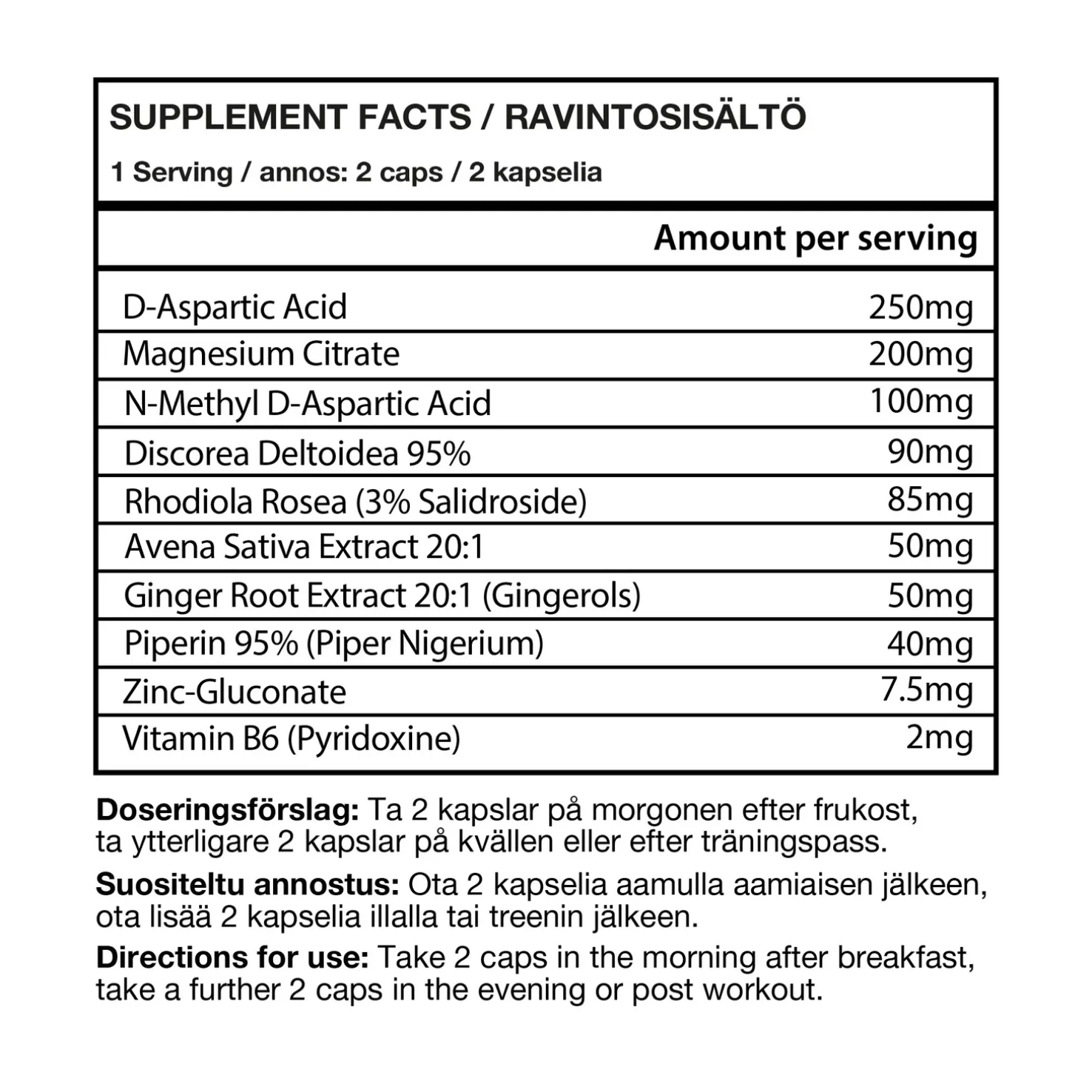 Ravintolisä testosteronin tuotannon lisäämiseksi. Auttaa parantamaan palautumisaikaa ja maksimoimaan lihasten kasvun. Pakkauksessa on 120 kapselia, mikä vastaa yhden kuukauden kulutusta.