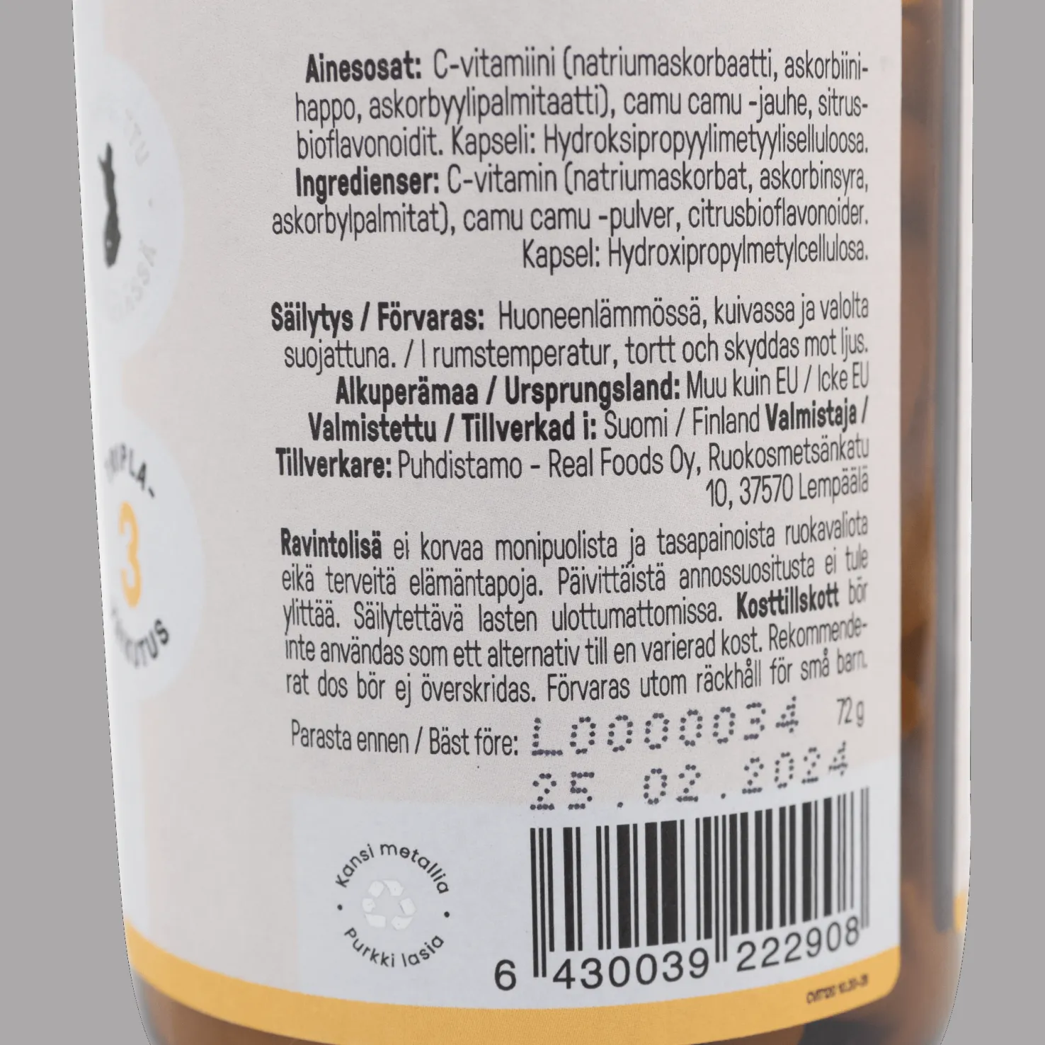 Ravintolisä. Ravintolisä ei korvaa monipuolista ja tasapainoista ruokavaliota eikä terveitä elämäntapoja. Päivittäistä annossuositusta ei tule ylittää. Säilytettävä pienten lasten ulottumattomissa.