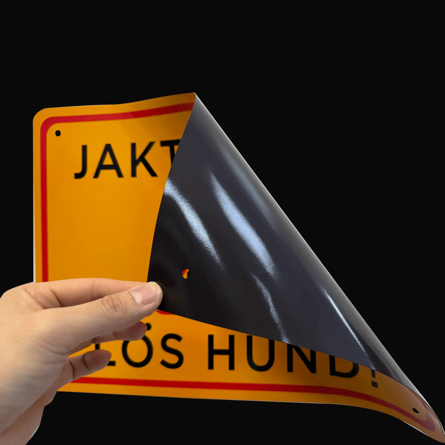 Vedenkestävä metsästys käynnissä -varoituskyltti, jossa on infoteksti ja kuva. Kyltin mitat ovat 42 x 30 cm, se on pehmeä ja siinä on magneettinen tausta. Ruuvinreiät jokaisessa kulmassa. Erittäin näkyvä väri.