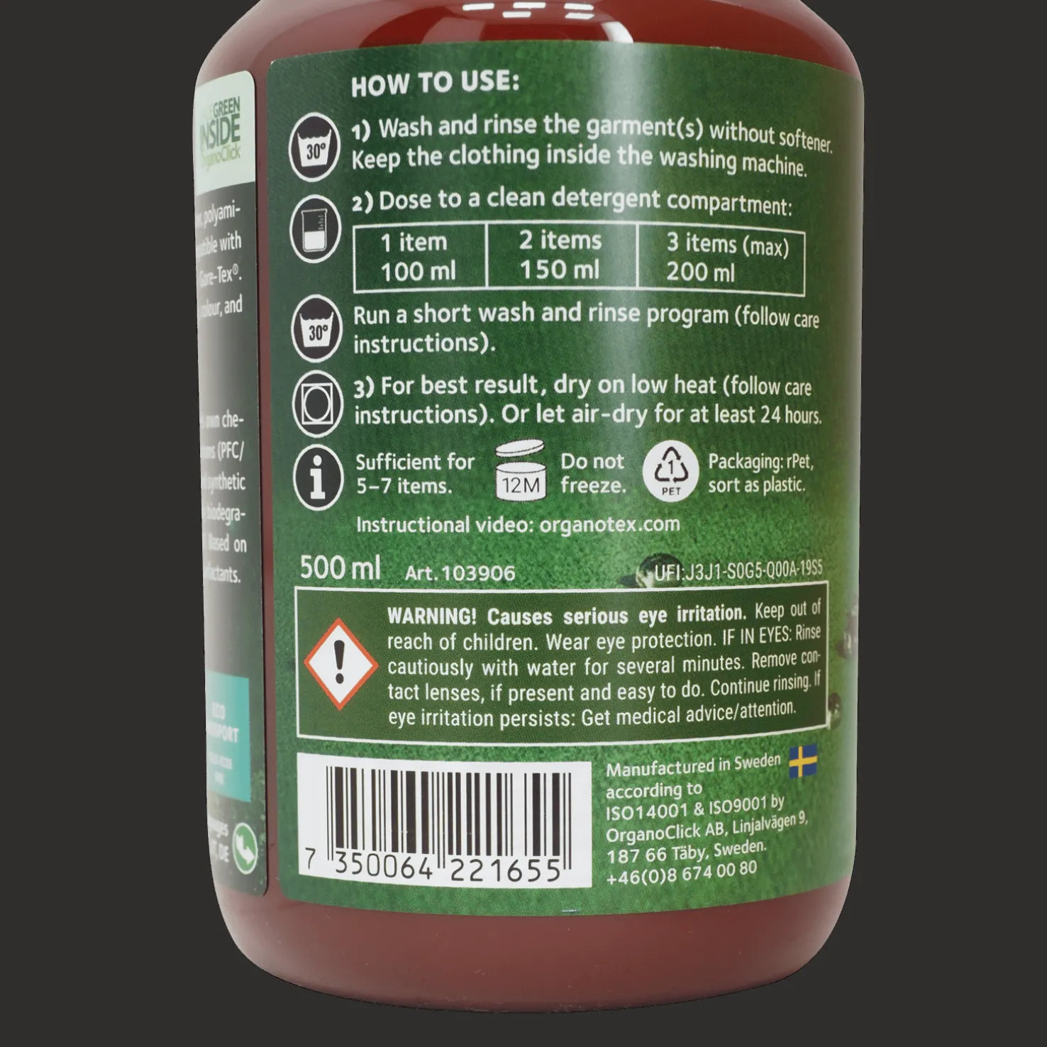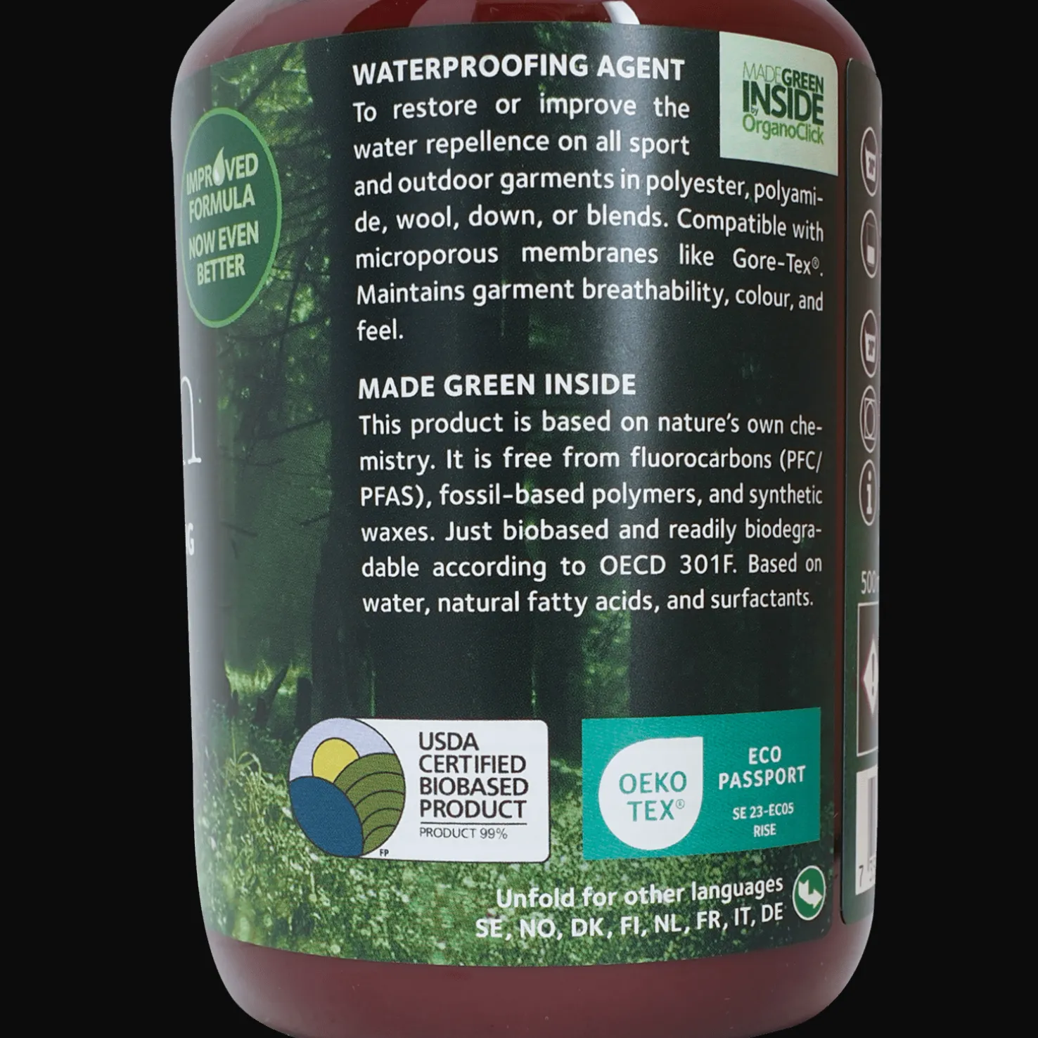 Pesuaine teknisille vaatteille, joissa on tex-kalvo. Helposti biohajoava, kehitetty ja valmistettu Ruotsissa.